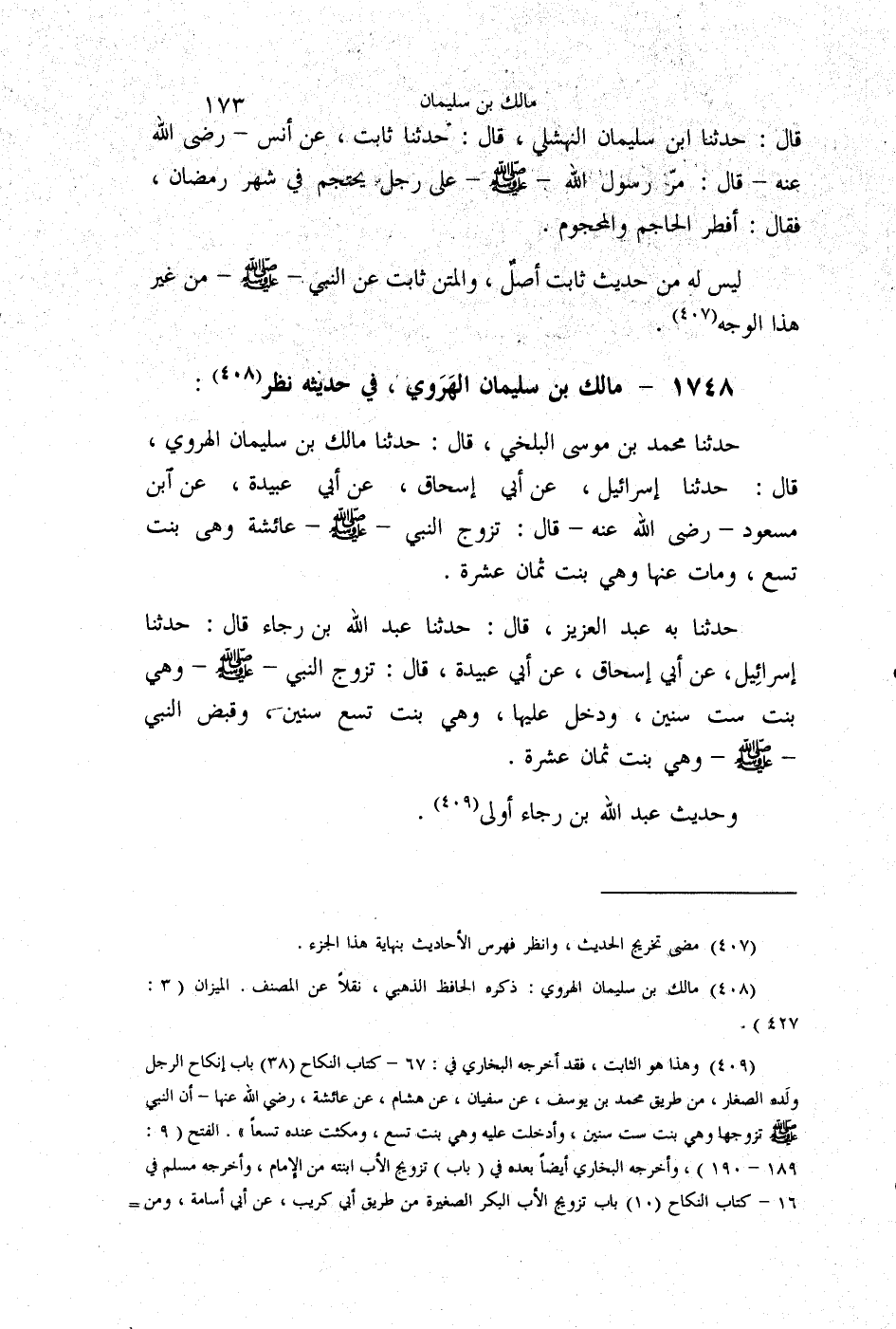 حَدَّثَنَا مُحَمَّدُ بْنُ مُوسَى الْبَلْخِيُّ قَالَ: حَدَّثَنَا مَالِكُ بْنُ سُلَيْمَانَ الْهَرَوِيُّ قَالَ: حَدَّثَنَا إِسْرَائِيلُ، عَنْ أَبِي إِسْحَاقَ، عَنْ أَبِي عُبَيْدَةَ، عَنِ ابْنِ مَسْعُودٍ، - رَضِيَ اللَّهُ عَنْهُ - قَالَ: §«تَزَوَّجَ النَّبِيُّ صَلَّى اللهُ عَلَيْهِ وَسَلَّمَ , عَائِشَةَ وَهِيَ بِنْتُ تِسْعٍ , وَمَاتَ عَنْهَا وَهِيَ بِنْتُ ثَمَانَ عَشْرَةَ»