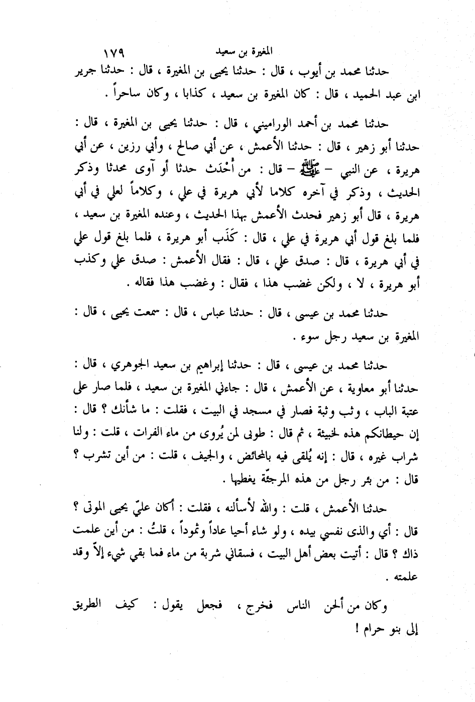 حَدَّثَنَا مُحَمَّدُ بْنُ أَحْمَدَ الْوَرَامَيْنِيُّ قَالَ: حَدَّثَنَا يَحْيَى بْنُ الْمُغِيرَةِ قَالَ: حَدَّثَنَا أَبُو زُهَيْرٍ قَالَ: حَدَّثَنَا الْأَعْمَشُ، عَنْ أَبِي صَالِحٍ، وَأَبِي رَزِينٍ , عَنْ أَبِي هُرَيْرَةَ، عَنِ النَّبِيِّ صَلَّى اللهُ عَلَيْهِ وَسَلَّمَ , قَالَ: §«مَنْ أَحْدَثَ حَدَثًا أَوْ آوَى مُحْدِثًا» . وَذَكَرَ الْحَدِيثَ، وَذَكَرَ فِي آخِرِهِ كَلَامًا لِأَبِي هُرَيْرَةَ فِي عَلِيٍّ , وَكَلَامًا لِعَلِيٍّ فِي أَبِي هُرَيْرَةَ قَالَ: أَبُو زُهَيْرٍ فَحَدَّثَ الْأَعْمَشَ بِهَذَا الْحَدِيثِ وَعِنْدَهُ الْمُغِيرَةُ بْنُ سَعِيدٍ , فَلَمَّا بَلَغَ قَوْلَ أَبِي هُرَيْرَةَ فِي عَلِيٍّ قَالَ: كَذَبَ أَبُو هُرَيْرَةَ، فَلَمَّا بَلَغَ قَوْلَ عَلِيٍّ فِي أَبِي هُرَيْرَةَ قَالَ: صَدَقَ عَلِيٌّ , قَالَ: فَقَالَ الْأَعْمَشُ: صَدَقَ عَلِيٌّ , وَكَذَبَ أَبُو هُرَيْرَةَ , لَا , وَلَكِنْ غَضِبَ هَذَا , فَقَالَ: وَغَضِبَ هَذَا , فَقَالَهُ حَدَّثَنَا مُحَمَّدُ بْنُ عِيسَى قَالَ: حَدَّثَنَا عَبَّاسٌ قَالَ: سَمِعْتُ يَحْيَى قَالَ: الْمُغِيرَةُ بْنُ سَعِيدٍ رَجُلُ سُوءٍ حَدَّثَنَا مُحَمَّدُ بْنُ عِيسَى قَالَ: حَدَّثَنَا إِبْرَاهِيمُ بْنُ سَعِيدٍ الْجَوْهَرِيُّ قَالَ: حَدَّثَنَا أَبُو مُعَاوِيَةَ، عَنِ الْأَعْمَشِ قَالَ: جَاءَنِي الْمُغِيرَةُ بْنُ سَعِيدٍ , فَلَمَّا صَارَ عَلَى عَتَبَةِ الْبَابِ وَثَبَ وَثْبَةً , فَصَارَ فِي مَسْجِدٍ فِي الْبَيْتِ , فَقُلْتُ مَا شَأْنُكَ؟ , قَالَ: إِنَّ حِيطَانَكُمْ هَذِهِ لَخَبِيثَةٌ , ثُمَّ قَالَ: طُوبَى لِمَنْ يُرْوَى مِنْ مَاءِ الْفُرَاتِ , قُلْتُ: وَلَنَا شَرَابٌ غَيْرُهُ؟ قَالَ: إِنَّهُ يُلْقَى فِيهِ بِالْمَحَائِضِ وَالْجِيَفِ , قُلْتُ: مِنْ أَيْنَ تَشْرَبُ؟ قَالَ: مِنْ بِئْرِ رَجُلٍ مِنْ هَذِهِ الْمُرْجِئَةِ يُغَطِّيهَا. حَدَّثَنَا الْأَعْمَشُ، قُلْتُ: وَاللَّهِ لَأَسْأَلَنَّهُ , فَقُلْتُ: أَكَانَ عَلِيٌّ يُحْيِي الْمَوْتَى؟ قَالَ: إِي وَالَّذِي نَفْسِي بِيَدِهِ , وَلَوْ شَاءَ أَحْيَا عَادًا وَثَمُودَ , قُلْتُ: مِنْ أَيْنَ عَلِمْتَ ذَاكَ؟ قَالَ: أَتَيْتُ بَعْضَ أَهْلِ الْبَيْتِ فَسَقَانِي شَرْبَةً مِنْ مَاءٍ , فَمَا بَقِيَ شَيْءٌ إِلَّا وَقَدْ عَلِمْتُهُ. وَكَانَ مِنْ أَلْحَنِ النَّاسِ , فَخَرَجَ فَجَعَلَ يَقُولُ: كَيْفَ الطَّرِيقُ إِلَى بَنُو حَرَامٍ -[180]- حَدَّثَنَا مُحَمَّدُ بْنُ عَبْدِ اللَّهِ الْحَضْرَمِيُّ قَالَ: حَدَّثَنَا أَبُو كُرَيْبٍ قَالَ: حَدَّثَنَا أَبُو مُعَاوِيَةَ، عَنِ الْأَعْمَشِ قَالَ: أَوَّلُ مَنْ سَمِعْتُ يُنْتَقَصُ أَبَا بَكْرٍ، وَعُمَرَ، رَضِيَ اللَّهُ عَنْهُمَا , الْمُغِيرَةُ بْنُ سَعِيدٍ الْمَصْلُوبُ حَدَّثَنَا مُحَمَّدُ بْنُ زَكَرِيَّا قَالَ: حَدَّثَنَا مَسْرُوقُ بْنُ الْمَرْزُبَانِ قَالَ: حَدَّثَنَا أَبُو مُعَاوِيَةَ قَالَ: قَالَ الْأَعْمَشُ: أَوَّلُ مَنْ سَمِعْتُ يَسُبُّ أَبَا بَكْرٍ، وَعُمَرَ، رَضِيَ اللَّهُ عَنْهُمَا , الْمُغِيرَةُ بْنُ سَعِيدٍ حَدَّثَنَا جَعْفَرُ بْنُ مُحَمَّدٍ الْفِرْيَابِيُّ قَالَ: حَدَّثَنَا بِشْرُ بْنُ الْوَلِيدِ قَالَ: حَدَّثَنَا يَحْيَى بْنُ الْمُتَوَكِّلِ أَبُو عَقِيلٍ، عَنْ كَثِيرِ بْنِ إِسْمَاعِيلَ قَالَ: سَمِعْتُ أَبَا جَعْفَرٍ، بَرِئَ اللَّهُ وَرَسُولُهُ مِنَ الْمُغِيرَةِ بْنِ سَعِيدٍ , وَبَيَانَ فَإِنَّهُمَا كَذَبَا عَلَيْنَا - أَهْلَ الْحَدِيثِ - حَدَّثَنَا مُحَمَّدُ بْنُ أَيُّوبَ قَالَ: حَدَّثَنَا يَحْيَى بْنُ الْمُغِيرَةِ قَالَ: حَدَّثَنَا جَرِيرٌ قَالَ: قَالَ الْأَعْمَشُ: قُلْتُ لِلْمُغِيرَةِ بْنِ سَعِيدٍ: أَيَقْدِرُ عَلِيٌّ أَنْ يُحْيِيَ الْمَوْتَى؟ قَالَ: وَالَّذِي أَحْلِفُ بِهِ لَوْ شَاءَ لَأَحْيَا عَادًا وَثَمُودَ , وَأَصْحَابَ الرَّسِّ , وَقُرُونًا بَيْنَ ذَلِكَ كَثِيرًا حَدَّثَن
