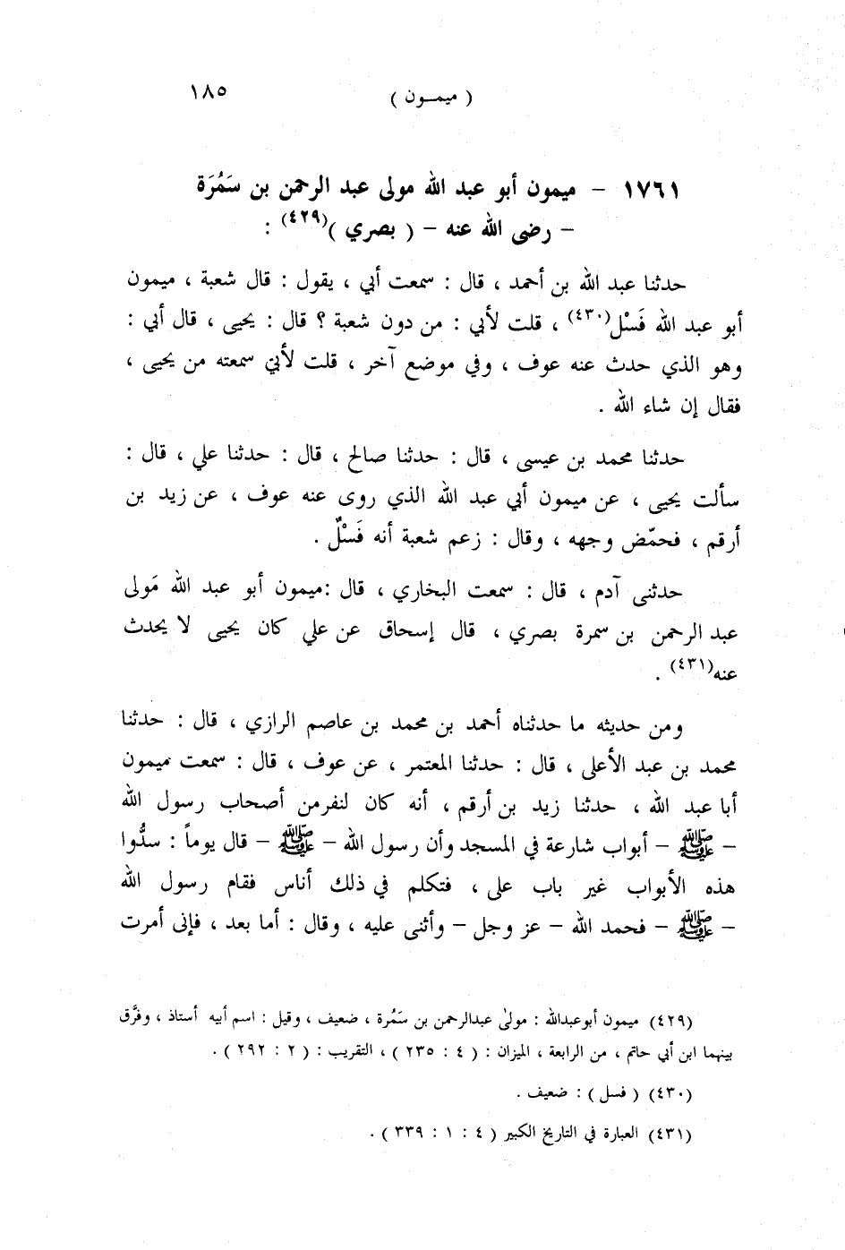 §1761 - مَيْمُونٌ أَبُو عَبْدِ اللَّهِ مَوْلَى عَبْدِ الرَّحْمَنِ بْنِ سَمُرَةَ , رَضِيَ اللَّهُ عَنْهُ , بَصْرِيٌّ. حَدَّثَنَا عَبْدُ اللَّهِ بْنُ أَحْمَدَ قَالَ: سَمِعْتُ أَبِي يَقُولُ: قَالَ شُعْبَةُ: مَيْمُونٌ أَبُو عَبْدِ اللَّهِ فَسْلٌ , قُلْتُ لِأَبِي: مَنْ دُونَ شُعْبَةَ؟ قَالَ: يَحْيَى , قَالَ أَبِي: وَهُوَ الَّذِي حَدَّثَ عَنْهُ عَوْفٌ , وَفِي مَوْضِعٍ آخَرَ قُلْتُ لِأَبِي: سَمِعْتَهُ مِنْ يَحْيَى؟ فَقَالَ: إِنْ شَاءَ اللَّهُ. حَدَّثَنَا مُحَمَّدُ بْنُ عِيسَى قَالَ: حَدَّثَنَا صَالِحٌ قَالَ: حَدَّثَنَا عَلِيٌّ قَالَ: سَأَلْتُ يَحْيَى عَنْ مَيْمُونٍ أَبِي عَبْدِ اللَّهِ، الَّذِي رَوَى عَنْهُ عَوْفٌ , عَنْ زَيْدِ بْنِ أَرْقَمَ، فَحَمَّضَ وَجْهَهُ , وَقَالَ: زَعَمَ شُعْبَةُ أَنَّهُ فَسْلٌ. حَدَّثَنِي آدَمُ قَالَ: سَمِعْتُ الْبُخَارِيَّ قَالَ: مَيْمُونٌ أَبُو عَبْدِ اللَّهِ مَوْلَى عَبْدِ الرَّحْمَنِ بْنِ سَمُرَةَ بَصْرِيٌّ , قَالَ إِسْحَاقُ عَنْ عَلِيٍّ: كَانَ يَحْيَى لَا يُحَدِّثُ عَنْهُ