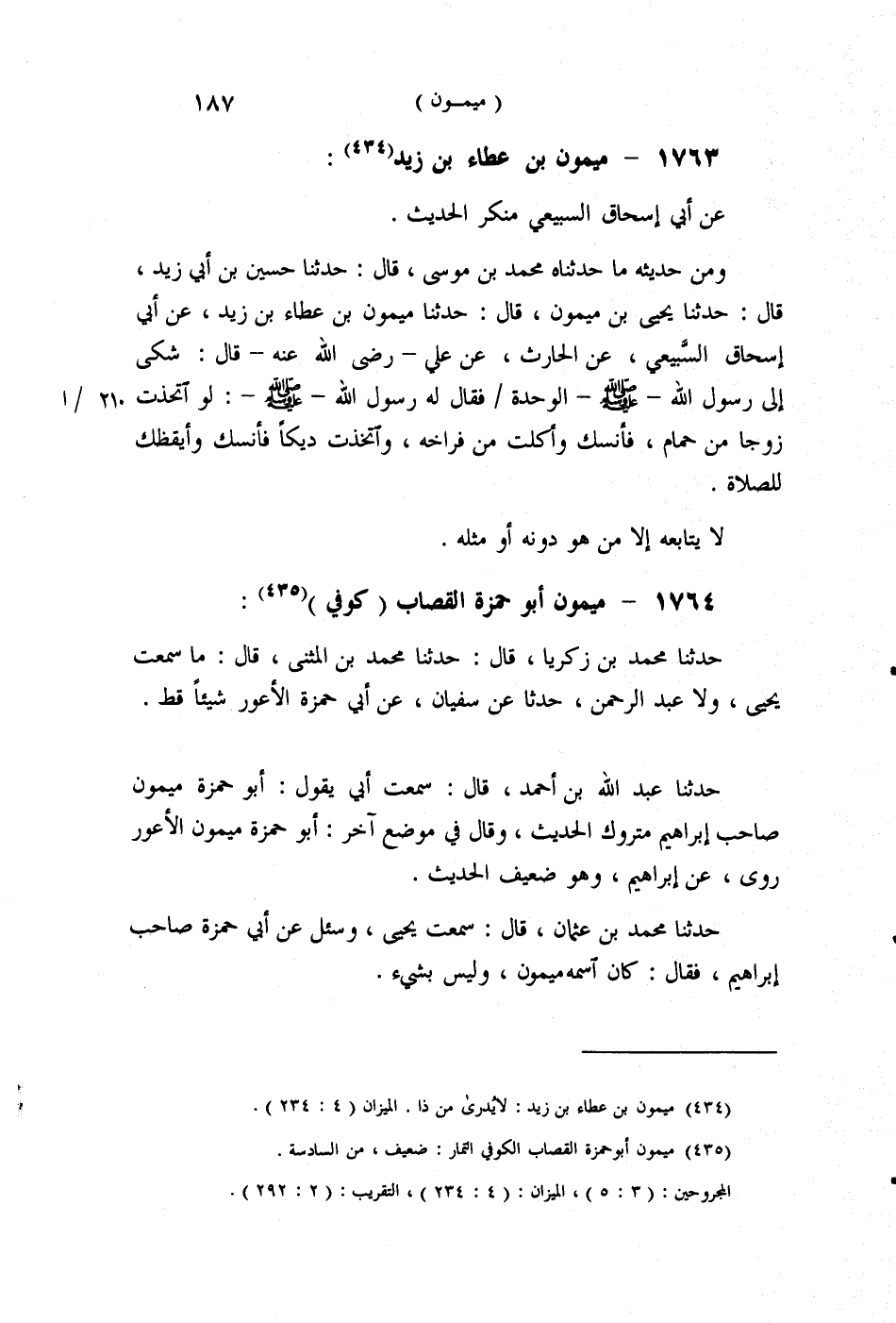 §1764 - مَيْمُونٌ أَبُو حَمْزَةَ الْقَصَّابُ كُوفِيٌّ حَدَّثَنَا مُحَمَّدُ بْنُ زَكَرِيَّا قَالَ: حَدَّثَنَا مُحَمَّدُ بْنُ الْمُثَنَّى قَالَ: مَا سَمِعْتُ يَحْيَى، وَلَا عَبْدَ الرَّحْمَنِ حَدَّثَا عَنْ سُفْيَانَ، عَنْ أَبِي حَمْزَةَ الْأَعْوَرِ، شَيْئًا قَطُّ. حَدَّثَنَا عَبْدُ اللَّهِ بْنُ أَحْمَدَ قَالَ: سَمِعْتُ أَبِي يَقُولُ: أَبُو حَمْزَةَ مَيْمُونٌ صَاحِبُ إِبْرَاهِيمَ مَتْرُوكُ الْحَدِيثِ , وَقَالَ فِي مَوْضِعٍ آخَرَ: أَبُو حَمْزَةَ مَيْمُونٌ الْأَعْوَرُ رَوَى عَنْ إِبْرَاهِيمَ , وَهُوَ ضَعِيفُ الْحَدِيثِ. حَدَّثَنَا مُحَمَّدُ بْنُ عُثْمَانَ قَالَ: سَمِعْتُ يَحْيَى، وَسُئِلَ عَنْ أَبِي حَمْزَةَ، صَاحِبِ إِبْرَاهِيمَ , فَقَالَ: كَانَ اسْمُهُ مَيْمُونًا , وَلَيْسَ بِشَيْءٍ. حَدَّثَنَا مُحَمَّدُ بْنُ عِيسَى قَالَ: حَدَّثَنَا عَبَّاسٌ قَالَ: سَمِعْتُ يَحْيَى، يَقُولُ: أَبُو حَمْزَةَ صَاحِبُ إِبْرَاهِيمَ اسْمُهُ مَيْمُونٌ , وَأَبُو حَمْزَةَ الثُّمَالِيُّ ثَابِتٌ , قُلْتُ: أَيُّهُمَا أَحَبُّ إِلَيْكَ؟ قَالَ: لَا ذَا , وَلَا ذَا. حَدَّثَنِي آدَمُ قَالَ: سَمِعْتُ الْبُخَارِيَّ قَالَ: مَيْمُونٌ أَبُو حَمْزَةَ الْقَصَّابُ الْأَعْوَرُ الْكُوفِيُّ لَيْسَ بِذَاكَ