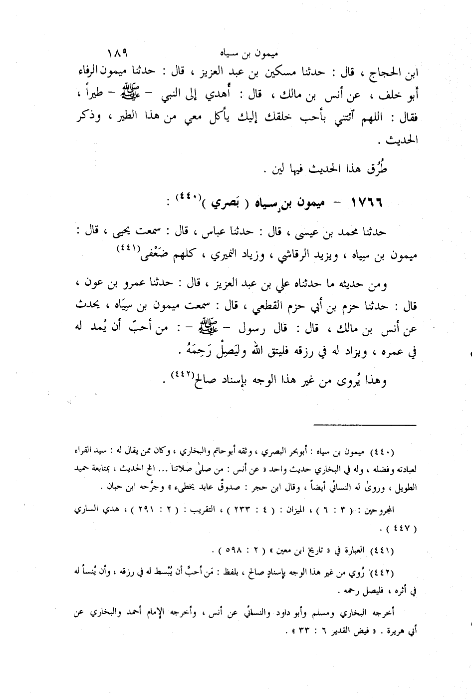 §1766 - مَيْمُونُ بْنُ سِيَاهٍ بَصْرِيٌّ حَدَّثَنَا مُحَمَّدُ بْنُ عِيسَى قَالَ: حَدَّثَنَا عَبَّاسٌ قَالَ: سَمِعْتُ يَحْيَى قَالَ: مَيْمُونُ بْنُ سِيَاهٍ , وَيَزِيدُ الرَّقَاشِيُّ , وَزِيَادٌ النُّمَيْرِيُّ كُلُّهُمْ ضَعْفَى