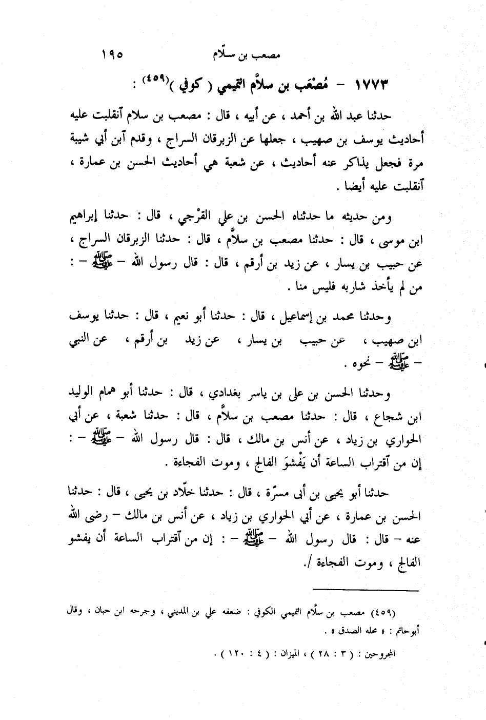 §1773 - مُصْعَبُ بْنُ سَلَّامٍ التَّمِيمِيُّ كُوفِيٌّ حَدَّثَنَا عَبْدُ اللَّهِ بْنُ أَحْمَدَ، عَنْ أَبِيهِ، قَالَ: مُصْعَبُ بْنُ سَلَّامٍ انْقَلَبَتْ عَلَيْهِ أَحَادِيثُ يُوسُفَ بْنِ صُهَيْبٍ , جَعَلَهَا عَنِ الزِّبْرِقَانِ السَّرَّاجِ، وَقَدِمَ ابْنُ أَبِي شَيْبَةَ، مَرَّةً , فَجَعَلَ يُذَاكِرُ عَنْهُ أَحَادِيثَ , عَنْ شُعْبَةَ، هِيَ أَحَادِيثُ الْحَسَنِ بْنِ عُمَارَةَ , انْقَلَبَتْ عَلَيْهِ أَيْضًا