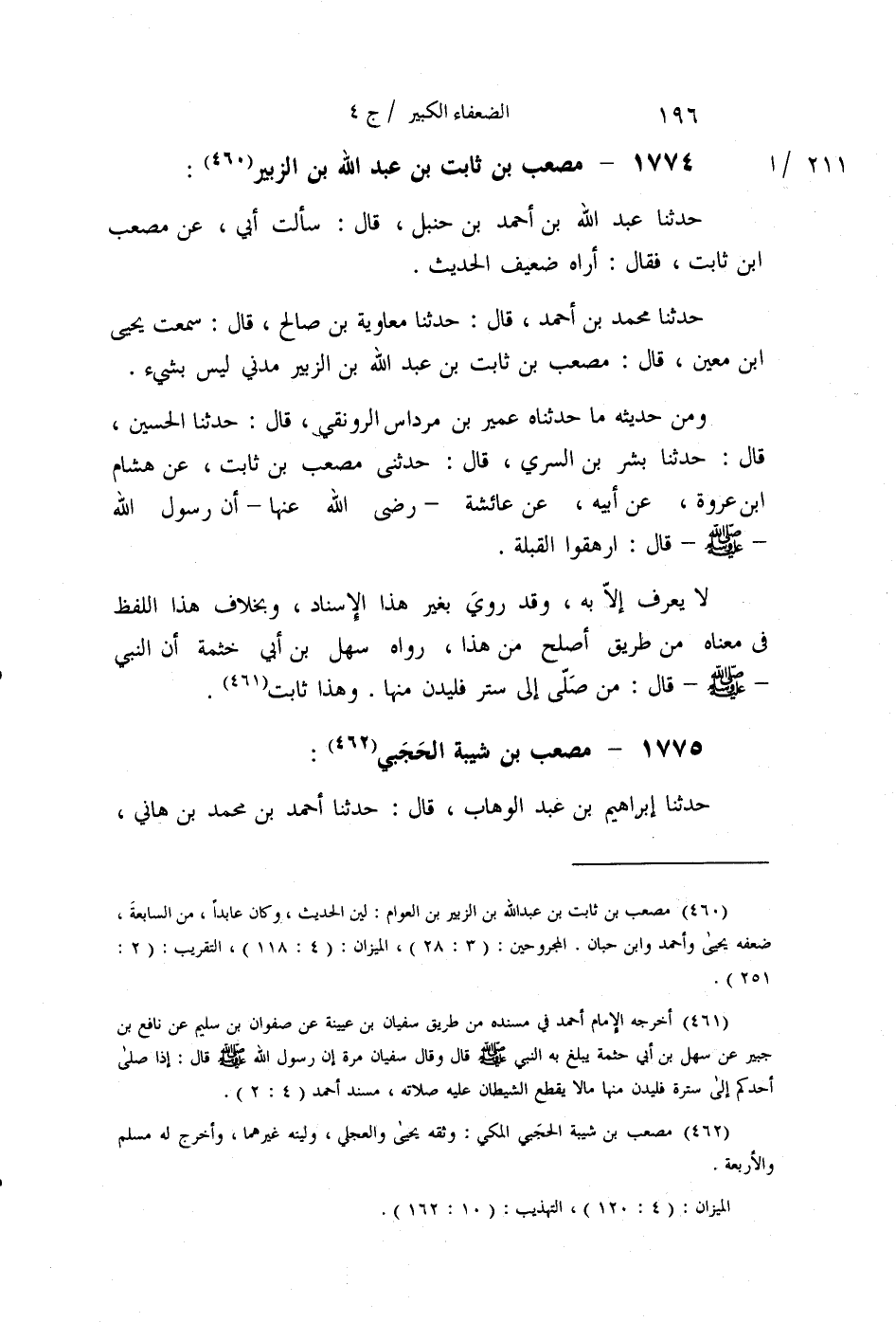 §1774 - مُصْعَبُ بْنُ ثَابِتِ بْنِ عَبْدِ اللَّهِ بْنِ الزُّبَيْرِ حَدَّثَنَا عَبْدُ اللَّهِ بْنُ أَحْمَدَ بْنِ حَنْبَلٍ قَالَ: سَأَلْتُ أَبِي عَنْ مُصْعَبِ بْنِ ثَابِتِ، فَقَالَ: أُرَاهُ ضَعِيفَ الْحَدِيثِ. حَدَّثَنَا مُحَمَّدُ بْنُ أَحْمَدَ قَالَ: حَدَّثَنَا مُعَاوِيَةُ بْنُ صَالِحٍ قَالَ: سَمِعْتُ يَحْيَى بْنَ مَعِينٍ قَالَ: مُصْعَبُ بْنُ ثَابِتِ بْنِ عَبْدِ اللَّهِ بْنِ الزُّبَيْرِ مَدَنِيٌّ لَيْسَ بِشَيْءٍ