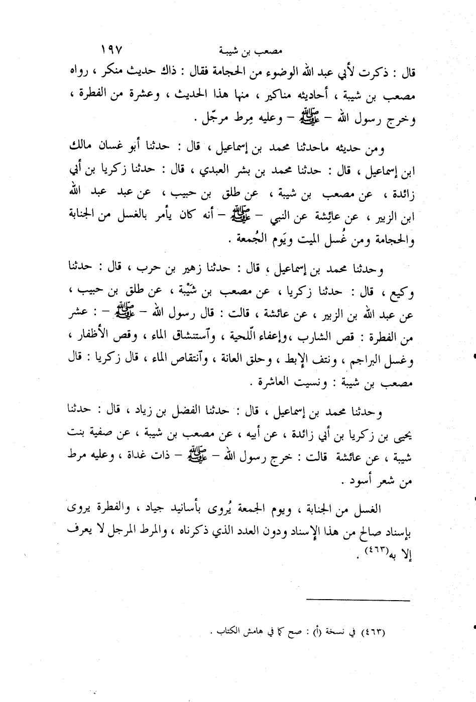 وَمِنْ حَدِيثِهِ مَا حَدَّثَنَا مُحَمَّدُ بْنُ إِسْمَاعِيلَ قَالَ: حَدَّثَنَا أَبُو غَسَّانَ مَالِكُ بْنُ إِسْمَاعِيلَ , قَالَ: حَدَّثَنَا مُحَمَّدُ بْنُ بِشْرٍ الْعَبْدِيُّ قَالَ: حَدَّثَنَا زَكَرِيَّا بْنُ أَبِي زَائِدَةَ، عَنْ مُصْعَبِ بْنِ شَيْبَةَ، عَنْ طَلْقِ بْنِ حَبِيبٍ، عَنْ عَبْدِ اللَّهِ بْنِ الزُّبَيْرِ، عَنْ عَائِشَةَ، عَنِ النَّبِيِّ صَلَّى اللهُ عَلَيْهِ وَسَلَّمَ , «أَنَّهُ كَانَ §يَأْمُرُ بِالْغُسْلِ مِنَ الْجَنَابَةِ , وَالْحِجَامَةِ , وَمِنْ غُسْلِ الْمَيِّتِ , وَيَوْمَ الْجُمُعَةِ»