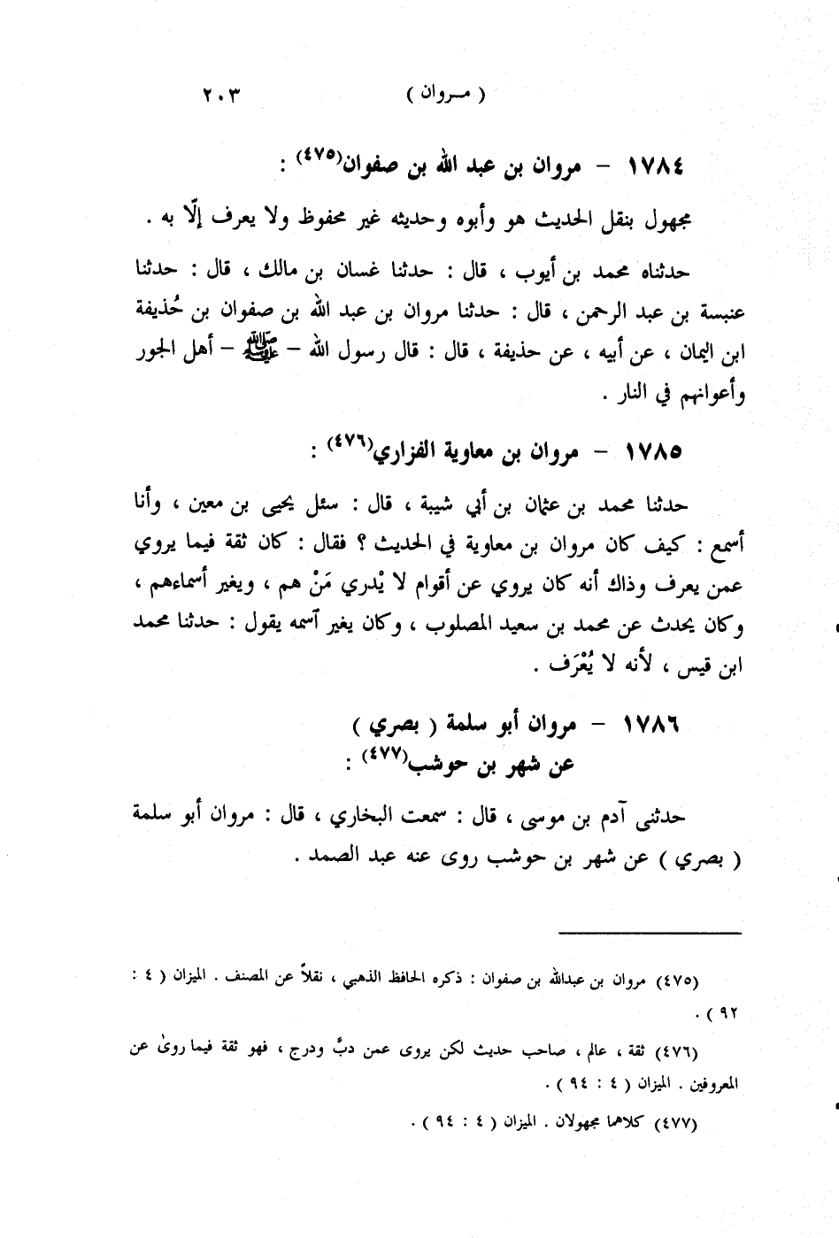 §1785 - مَرْوَانُ بْنُ مُعَاوِيَةَ الْفَزَارِيُّ حَدَّثَنَا مُحَمَّدُ بْنُ عُثْمَانَ بْنِ أَبِي شَيْبَةَ قَالَ: سُئِلَ يَحْيَى بْنُ مَعِينٍ وَأَنَا أَسْمَعُ، كَيْفَ كَانَ مَرْوَانُ بْنُ مُعَاوِيَةَ فِي الْحَدِيثِ؟ فَقَالَ: كَانَ ثِقَةً فِيمَا يَرْوِي عَمَّنْ يُعْرَفُ , وَذَاكَ أَنَّهُ كَانَ يَرْوِي عَنْ أَقْوَامٍ لَا يَدْرِي مَنْ هُمْ وَيُغَيِّرُ أَسْمَاءَهُمْ , وَكَانَ يُحَدِّثُ عَنْ مُحَمَّدِ بْنِ سَعِيدٍ الْمَصْلُوبِ , وَكَانَ يُغَيِّرُ اسْمَهُ , يَقُولُ: حَدَّثَنَا مُحَمَّدُ بْنُ قَيْسٍ لِأَنَّهُ لَا يُعْرَفُ