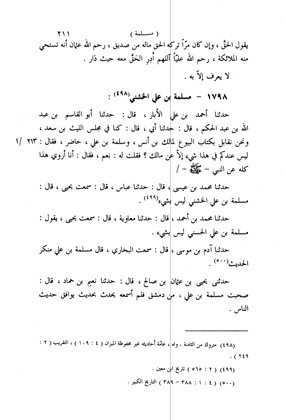 §1798 - مَسْلَمَةُ بْنُ عُلَيٍّ الْخُشَنِيُّ حَدَّثَنَا أَحْمَدُ بْنُ عَلِيٍّ الْأَبَّارُ قَالَ: حَدَّثَنَا أَبُو الْقَاسِمِ بْنُ عَبْدِ اللَّهِ بْنِ عَبْدِ الْحَكَمِ قَالَ: حَدَّثَنَا أَبِي، قَالَ: كُنَّا فِي مَجْلِسِ اللَّيْثِ بْنِ سَعْدٍ , وَنَحْنُ نُقَابِلُ بِكِتَابِ الْبُيُوعِ لِمَالِكِ بْنِ أَنَسٍ , وَمَسْلَمَةُ بْنُ عَلِيٍّ حَاضِرٌ , فَقَالَ: لَيْسَ عِنْدَكُمْ فِي هَذَا شَيْءٌ إِلَّا عَنْ مَالِكٍ؟ فَقُلْتُ لَهُ: نَعَمْ، فَقَالَ: أَنَا أَرْوِي هَذَا كُلَّهُ عَنِ النَّبِيِّ صَلَّى اللهُ عَلَيْهِ وَسَلَّمَ. حَدَّثَنَا مُحَمَّدُ بْنُ عِيسَى قَالَ: حَدَّثَنَا عَبَّاسٌ قَالَ: سَمِعْتُ يَحْيَى قَالَ: مَسْلَمَةُ بْنُ عَلِيٍّ الْخُشَنِيُّ لَيْسَ بِشَيْءٍ. حَدَّثَنَا مُحَمَّدُ بْنُ أَحْمَدَ قَالَ: حَدَّثَنَا مُعَاوِيَةُ قَالَ: سَمِعْتُ يَحْيَى، يَقُولُ: مَسْلَمَةُ بْنُ عَلِيٍّ الْخُشَنِيُّ لَيْسَ بِشَيْءٍ. حَدَّثَنَا آدَمُ بْنُ مُوسَى، , قَالَ: سَمِعْتُ الْبُخَارِيَّ قَالَ: مَسْلَمَةُ بْنُ عَلِيٍّ مُنْكَرُ الْحَدِيثِ. حَدَّثَنِي يَحْيَى بْنُ عُثْمَانَ بْنِ صَالِحٍ قَالَ: حَدَّثَنَا نُعَيْمُ بْنُ حَمَّادٍ قَالَ: صَحِبْتُ مَسْلَمَةَ بْنَ عَلِيٍّ مِنْ دِمَشْقَ فَلَمْ أَسْمَعْهُ يُحَدِّثُ بِحَدِيثٍ يُوَافِقُ حَدِيثَ النَّاسِ