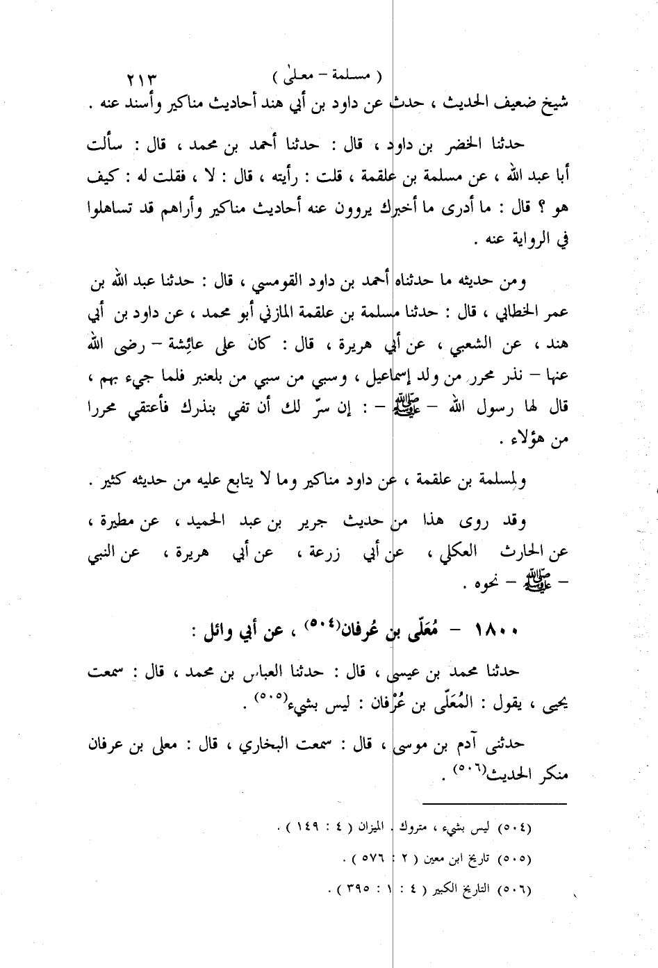 §1800 - مُعَلَّى بْنُ عُرْفَانَ عَنْ أَبِي وَائِلٍ، حَدَّثَنَا مُحَمَّدُ بْنُ عِيسَى قَالَ: حَدَّثَنَا الْعَبَّاسُ بْنُ مُحَمَّدٍ قَالَ: سَمِعْتُ يَحْيَى، يَقُولُ: الْمُعَلَّى بْنُ عُرْفَانَ لَيْسَ بِشَيْءٍ. حَدَّثَنِي آدَمُ بْنُ مُوسَى قَالَ: سَمِعْتُ الْبُخَارِيَّ قَالَ: مُعَلَّى بْنُ عُرْفَانَ مُنْكَرُ الْحَدِيثِ