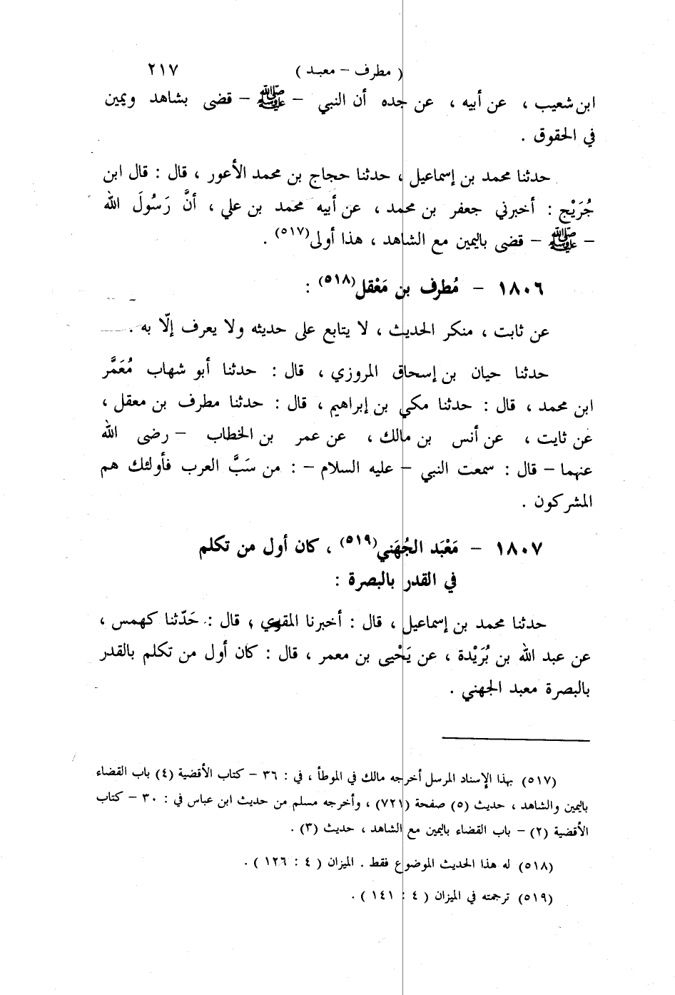 §1807 - مَعْبَدُ الْجُهَنِيُّ كَانَ أَوَّلُ مَنْ تَكَلَّمَ فِي الْقَدَرِ بِالْبَصْرَةِ. حَدَّثَنَا مُحَمَّدُ بْنُ إِسْمَاعِيلَ قَالَ: أَخْبَرَنَا الْمُقْرِئُ قَالَ: حَدَّثَنَا كَهْمَسٌ، عَنْ عَبْدِ اللَّهِ بْنِ بُرَيْدَةَ، عَنْ يَحْيَى بْنِ مَعْمَرٍ قَالَ: كَانَ أَوَّلَ مَنْ تَكَلَّمَ بِالْقَدَرِ بِالْبَصْرَةِ مَعْبَدٌ الْجُهَنِيُّ -[218]-. حَدَّثَنَا مُحَمَّدُ بْنُ أَيُّوبَ قَالَ: حَدَّثَنَا عَبْدُ الرَّحْمَنِ بْنُ الْمُبَارَكِ قَالَ: حَدَّثَنَا حَمَّادُ بْنُ زَيْدٍ قَالَ: حَدَّثَنَا أَبُو طَلْحَةَ، عَنْ غَيْلَانَ بْنِ جَرِيرٍ قَالَ: سَمِعْتُ الْحَسَنَ، يَقُولُ: لَا تُجَالِسُوا مَعْبَدًا , إِنَّهُ ضَالٌّ مُضِلٌّ. حَدَّثَنَا عَبْدُ اللَّهِ بْنُ أَحْمَدَ قَالَ: حَدَّثَنِي أَبِي قَالَ: حَدَّثَنَا أَبُو سَعِيدٍ، مَوْلَى ابْنِ هَاشِمٍ , قَالَ: حَدَّثَنَا رَبِيعَةُ بْنُ كُلْثُومِ بْنِ جَبْرٍ، عَنْ أَبِيهِ، قَالَ: كَانَ أَصْحَابُ مُسْلِمِ بْنِ يَسَارٍ , كَانَ مُسْلِمُ بْنُ يَسَارٍ يَقْعُدُ إِلَى هَذِهِ السَّارِيَةِ , فَقَالَ: إِنَّ مَعْبَدًا يَقُولُ بِقَوْلِ النَّصَارَى يَعْنِي مَعْبَدًا الْجُهَنِيَّ. حَدَّثَنَا إِبْرَاهِيمُ بْنُ مُحَمَّدٍ قَالَ: حَدَّثَنَا سُلَيْمَانُ بْنُ حَرْبٍ قَالَ: حَدَّثَنَا حَمَّادُ بْنُ زَيْدٍ، عَنِ ابْنِ عَوْنٍ قَالَ: أَمْرَانِ فِيكُمْ قَدْ أَدْرَكْتُ وَلَيْسَ فِينَا وَاحِدٌ مِنْهُمَا , هَذِهِ الْمُعْتَزِلَةُ وَهَذِهِ الْقَدَرِيَّةُ , وَكَانَ أَوَّلَ مَنْ تَكَلَّمَ هَاهُنَا فِي الْقَدَرِ مَعْبَدٌ الْجُهَنِيُّ , وَرَجُلٌ مِنَ الْأَسَاوِرَةِ يُقَالُ لَهُ سَيْسُوَهْ , وَكَانَ حَقِيرًا. حَدَّثَنَا مُحَمَّدُ بْنُ إِسْمَاعِيلَ قَالَ: حَدَّثَنَا الْحَسَنُ قَالَ: حَدَّثَنَا نُعَيْمٌ قَالَ: حَدَّثَنَا ابْنُ الْمُبَارَكِ قَالَ: حَدَّثَنَا رَبَاحُ بْنُ زَيْدٍ الصَّنْعَانِيُّ، عَنْ جَعْفَرِ بْنِ مُحَمَّدِ بْنِ عَبَّادٍ، عَنْ طَاوُسٍ أَنَّهُ قَالَ لمعَبْدٍ الْجُهَنِيِّ: أَنْتَ الَّذِي تَفْتَرِي عَلَى اللَّهِ عَزَّ وَجَلَّ؟ فَقَالَ لَهُ مَعْبَدٌ: كُذِبَ عَلَيَّ. حَدَّثَنَا إِبْرَاهِيمُ بْنُ يُوسُفَ قَالَ: حَدَّثَنَا أَبُو كُرَيْبٍ قَالَ: حَدَّثَنَا عَبْدُ الرَّحِيمِ، عَنْ يَحْيَى بْنِ سَعِيدٍ، عَنْ أَبِي الزُّبَيْرِ الْمَكِّيِّ قَالَ: مَرَرْتُ أَنَا وَطَاوُسٌ، فَإِذَا مَعْبَدٌ الْجُهَنِيُّ جَالِسٌ فِي جَنْبِ الْمَسْجِدِ , قَالَ: قُلْتُ لِطَاوُسٍ: هَذَا الَّذِي يَقُولُ فِي الْقَدَرِ مَا يَقُولُ؟ فَعَدَلَ إِلَيْهِ طَاوُسٌ حَتَّى وَقَفَ عَلَيْهِ , فَقَالَ: أَنْتَ الْمُفْتَرِي عَلَى اللَّهِ , الْقَائِلُ مَا لَا تَعْلَمُ؟، قَالَ مَعْبَدٌ: يُكْذَبُ عَلَيَّ , قَالَ: أَبُو الزُّبَيْرِ ثُمَّ غَدَوْنَا إِلَى ابْنِ عَبَّاسٍ , رَضِيَ اللَّهُ عَنْهُ , فَدَخَلْنَا عَلَيْهِ فَذَكَرَ لَنَا شَأْنَ مَنْ يَقُولُ فِي الْقَدَرِ مَا يَقُولُ: فَقَالَ ابْنُ عَبَّاسٍ , رَضِيَ اللَّهُ عَنْهُ: وَيْحَكُمْ أَرُونِي بَعْضَهُمْ , قُلْنَا: مَا أَنْتَ صَانِعٌ بِهِ؟ قَالَ: وَالَّذِي نَفْسِي بِيَدِهِ لَئِنْ أَرَيْتُمُونِي مِنْهُمْ أَحَدًا لَأَجْعَلَنَّ يَدِي فِي رَأْسِهِ لِأَدُقَّنَّ عُنُقَهُ