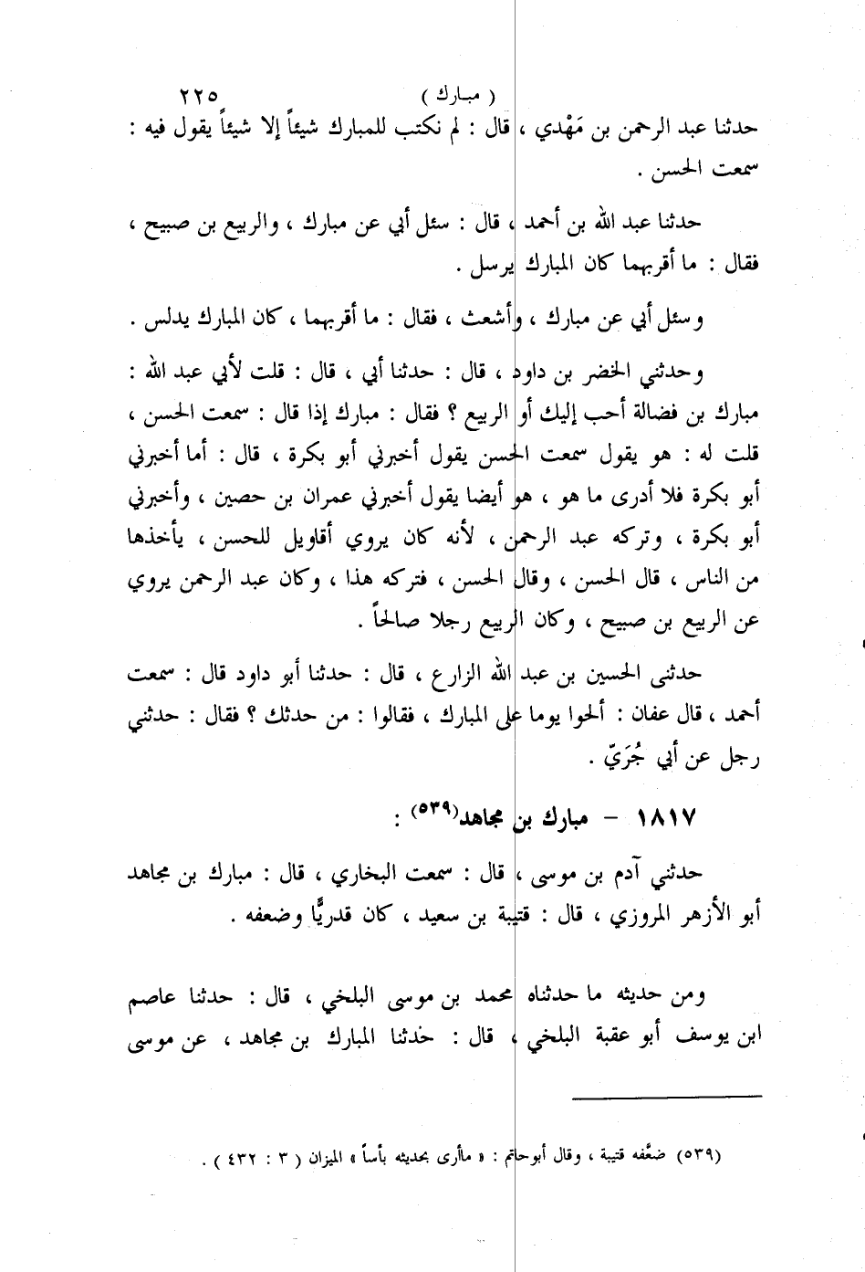 §1817 - مُبَارَكُ بْنُ مُجَاهِدٍ حَدَّثَنِي آدَمُ بْنُ مُوسَى قَالَ: سَمِعْتُ الْبُخَارِيَّ قَالَ: مُبَارَكُ بْنُ مُجَاهِدٍ أَبُو الْأَزْهَرِ الْمَرْوَزِيُّ , قَالَ قُتَيْبَةُ بْنُ سَعِيدٍ: كَانَ قَدَرِيًّا , وَضَعَّفَهُ