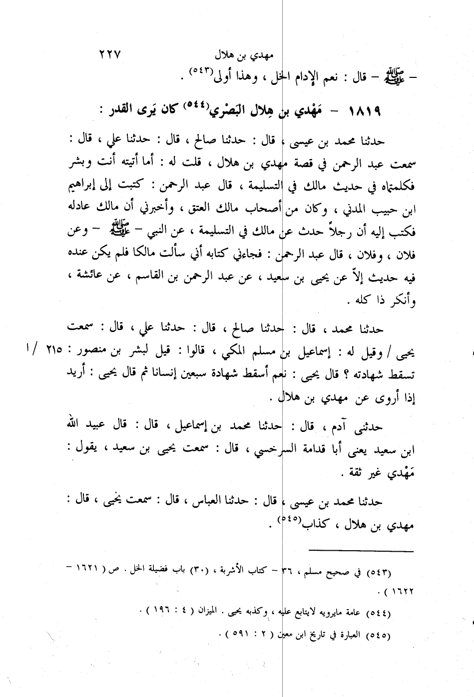 §1819 - مَهْدِيُّ بْنُ هِلَالٍ الْبَصْرِيُّ كَانَ يَرَى الْقَدَرَ. حَدَّثَنَا مُحَمَّدُ بْنُ عِيسَى قَالَ: حَدَّثَنَا صَالِحٌ قَالَ: حَدَّثَنَا عَلِيٌّ قَالَ: سَمِعْتُ عَبْدَ الرَّحْمَنِ، فِي قِصَّةِ مَهْدِيِّ بْنِ هِلَالٍ , قُلْتُ لَهُ: أَمَا أَتَيْتَهُ أَنْتَ وَبِشْرٌ فَكَلَّمْتُمَاهُ فِي حَدِيثِ مَالِكٍ فِي التَّسْلِيمَةِ , قَالَ عَبْدُ الرَّحْمَنِ: كَتَبْتُ إِلَى إِبْرَاهِيمَ بْنِ حَبِيبٍ الْمَدَنِيِّ , وَكَانَ مِنْ أَصْحَابِ مَالِكٍ الْعِتْقُ , وَأَخْبَرَنِي أَنَّ مَالِكًا عَادَلَهُ , فَكَتَبَ إِلَيْهِ أَنَّ رَجُلًا حَدَّثَ عَنْ مَالِكٍ فِي التَّسْلِيمَةِ عَنِ النَّبِيِّ صَلَّى اللهُ عَلَيْهِ وَسَلَّمَ , وَعَنْ فُلَانٍ وَفُلَانٍ , قَالَ عَبْدُ الرَّحْمَنِ: فَجَاءَنِي كِتَابُهُ , أَنِّي سَأَلْتُ مَالِكًا فَلَمْ يَكُنْ عِنْدَهُ فِيهِ حَدِيثٌ إِلَّا عَنْ يَحْيَى بْنِ سَعِيدٍ , عَنْ عَبْدِ الرَّحْمَنِ بْنِ الْقَاسِمِ , عَنْ عَائِشَةَ , وَأَنْكَرَ ذَا كُلَّهُ. حَدَّثَنَا مُحَمَّدٌ قَالَ: حَدَّثَنَا صَالِحٌ قَالَ: حَدَّثَنَا عَلِيٌّ قَالَ: سَمِعْتُ يَحْيَى، وَقِيلَ لَهُ إِسْمَاعِيلُ بْنُ مُسْلِمٍ الْمَكِّيُّ قَالُوا: قِيلَ لِبَشَرِ بْنُ مَنْصُورٍ: تَسْقُطُ شَهَادَتُهُ؟ قَالَ يَحْيَى: نَعَمْ , أُسْقِطُ شَهَادَةَ سَبْعِينَ إِنْسَانًا , ثُمَّ قَالَ يَحْيَى: أُرِيدُ إِذًا أَرْوِي عَنْ مَهْدِيِّ بْنِ هِلَالٍ. حَدَّثَنِي آدَمُ قَالَ: حَدَّثَنَا مُحَمَّدُ بْنُ إِسْمَاعِيلَ قَالَ: قَالَ عُبَيْدُ اللَّهِ بْنُ سَعِيدٍ , يَعْنِي أَبَا قُدَامَةَ السَّرَخْسِيَّ , قَالَ: سَمِعْتُ يَحْيَى بْنَ سَعِيدٍ، يَقُولُ: مَهْدِيٌّ غَيْرُ ثِقَةٍ. حَدَّثَنَا مُحَمَّدُ بْنُ عِيسَى قَالَ: حَدَّثَنَا الْعَبَّاسُ قَالَ: سَمِعْتُ يَحْيَى قَالَ: مَهْدِيُّ بْنُ هِلَالٍ كَذَّابٌ