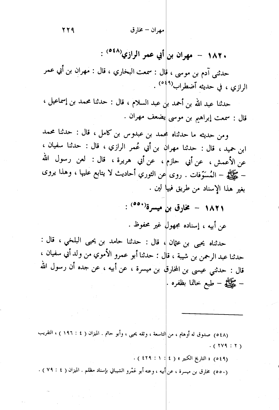 §1820 - مِهْرَانُ بْنُ أَبِي عُمَرَ الرَّازِيُّ حَدَّثَنِي آدَمُ بْنُ مُوسَى قَالَ: سَمِعْتُ الْبُخَارِيَّ قَالَ: مِهْرَانُ بْنُ أَبِي عُمَرَ الرَّازِيُّ فِي حَدِيثِهِ اضْطِرَابٌ. حَدَّثَنَا عَبْدُ اللَّهِ بْنُ أَحْمَدَ بْنِ عَبْدِ السَّلَامِ قَالَ: حَدَّثَنَا مُحَمَّدُ بْنُ إِسْمَاعِيلَ قَالَ: سَمِعْتُ إِبْرَاهِيمَ بْنَ مُوسَى يُضَعِّفُ مِهْرَانَ