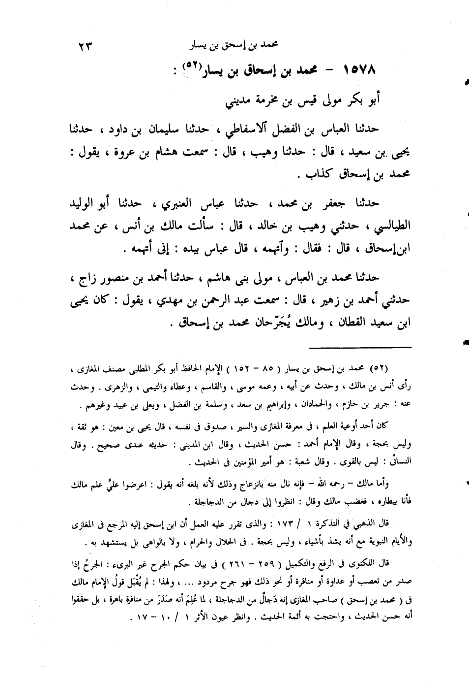 §1578 - مُحَمَّدُ بْنُ إِسْحَاقَ بْنِ يَسَارٍ أَبُو بَكْرٍ مَوْلَى قَيْسِ بْنِ مَخْرَمَةَ مَدِينِيٌّ. حَدَّثَنَا الْعَبَّاسُ بْنُ الْفَضْلِ الْأَسْفَاطِيُّ، حَدَّثَنَا سُلَيْمَانُ بْنُ دَاوُدَ، حَدَّثَنَا يَحْيَى بْنُ سَعِيدٍ قَالَ: حَدَّثَنَا وُهَيْبٌ قَالَ: سَمِعْتُ هِشَامَ بْنَ عُرْوَةَ، يَقُولُ: مُحَمَّدُ بْنُ إِسْحَاقَ كَذَّابٌ. حَدَّثَنَا جَعْفَرُ بْنُ مُحَمَّدٍ، حَدَّثَنَا عَبَّاسٌ الْعَنْبَرِيُّ، حَدَّثَنَا أَبُو الْوَلِيدِ الطَّيَالِسِيُّ، حَدَّثَنِي وُهَيْبُ بْنُ خَالِدٍ قَالَ: سَأَلْتُ مَالِكَ بْنَ أَنَسٍ , عَنْ مُحَمَّدِ بْنِ إِسْحَاقَ قَالَ: فَقَالَ وَاتَّهَمَهُ، قَالَ عَبَّاسٌ بِيَدِهِ: أَيِ اتَّهَمَهُ. حَدَّثَنَا مُحَمَّدُ بْنُ الْعَبَّاسِ مَوْلَى بَنِي هَاشِمٍ , حَدَّثَنَا أَحْمَدُ بْنُ مَنْصُورٍ زَاجٌ حَدَّثَنِي أَحْمَدُ بْنُ زُهَيْرٍ قَالَ: سَمِعْتُ عَبْدَ الرَّحْمَنِ بْنَ مَهْدِيٍّ يَقُولُ: كَانَ يَحْيَى بْنُ سَعِيدٍ الْقَطَّانُ وَمَالِكٌ يَجْرَحَانِ مُحَمَّدَ بْنَ إِسْحَاقَ -[24]-. حَدَّثَنَا مُحَمَّدُ بْنُ عَلِيٍّ الْأَبَّارُ، حَدَّثَنَا أَحْمَدُ بْنُ إِبْرَاهِيمَ الدَّوْرَقِيُّ، حَدَّثَنَا أَبُو دَاوُدَ، عَنْ مُحَمَّدِ بْنِ مُسْلِمِ بْنِ أَبِي الْوَضَّاحِ قَالَ: كُنْتُ عِنْدَ يَحْيَى بْنِ سَعِيدٍ الْقَطَّانِ، فَقِيلَ لَهُ: إِنَّ أَهْلَ الْعِرَاقِ يَرْوُونَ عَنْ مُحَمَّدِ بْنِ إِسْحَاقَ، فَقَالَ يَحْيَى: يَرْوُونَ الْعِلْمَ عَنْ مُحَمَّدِ بْنِ إِسْحَاقَ يَرْوُونَ الْعِلْمَ عَنْ مُحَمَّدِ بْنِ إِسْحَاقَ. حَدَّثَنِي الْفَضْلُ بْنُ جَعْفَرٍ، حَدَّثَنَا عَبْدُ الْمَلِكِ بْنُ مُحَمَّدٍ، حَدَّثَنِي سُلَيْمَانُ بْنُ دَاوُدَ، قَالَ لِي يَحْيَى بْنُ سَعِيدٍ الْقَطَّانُ: أَشْهَدُ أَنَّ مُحَمَّدَ بْنَ إِسْحَاقَ كَذَّابٌ، قَالَ: قُلْتُ: وَمَا يُدْرِيكَ؟ قَالَ: قَالَ لِي وُهَيْبُ بْنُ خَالِدٍ , فَقُلْتُ لِوُهَيْبٍ: مَا يُدْرِيكَ؟ قَالَ: قَالَ لِي مَالِكُ بْنُ أَنَسٍ , فَقُلْتُ لِمَالِكِ بْنِ أَنَسٍ: مَا يُدْرِيكَ؟ قَالَ: قَالَ لِي هِشَامُ بْنُ عُرْوَةَ , قَالَ: قُلْتُ لِهِشَامِ بْنِ عُرْوَةَ: وَمَا يُدْرِيكَ؟ قَالَ: حَدَّثَ عَنِ امْرَأَتِي فَاطِمَةَ ابْنَةِ الْمُنْذِرِ , وَدَخَلَتْ عَلَيَّ وَهِيَ بِنْتُ تِسْعِ سِنِينَ , وَمَا رَآهَا حَتَّى لَقِيَتِ اللَّهَ عَزَّ وَجَلَّ. حَدَّثَنَا مُحَمَّدُ بْنُ عِيسَى، حَدَّثَنَا صَالِحٌ، حَدَّثَنَا عَلِيٌّ قَالَ: سَمِعْتُ يَحْيَى، يَقُولُ، قُلْتُ لِهِشَامِ بْنِ عُرْوَةَ: ابْنُ إِسْحَاقَ يُحَدِّثُ عَنْ فَاطِمَةَ بِنْتِ الْمُنْذِرِ، فَقَالَ: أَهُوَ كَانَ يَصِلُ إِلَيْهَا؟ . حَدَّثَنَا أَحْمَدُ بْنُ عَلِيٍّ الْأَبَّارُ، حَدَّثَنَا إِبْرَاهِيمُ بْنُ زِيَادٍ سَبَلَانَ , حَدَّثَنَا حُسَيْنُ بْنُ عُرْوَةَ قَالَ: سَمِعْتُ مَالِكَ بْنَ أَنَسٍ يَقُولُ: مُحَمَّدُ بْنُ إِسْحَاقَ كَذَّابٌ. حَدَّثَنَا جَعْفَرُ بْنُ مُحَمَّدٍ، حَدَّثَنَا إِسْحَاقُ بْنُ إِبْرَاهِيمَ، حَدَّثَنَا يَحْيَى بْنُ آدَمَ، حَدَّثَنَا عَبْدُ اللَّهِ بْنُ إِدْرِيسَ قَالَ: كُنْتُ عِنْدَ مَالِكِ بْنِ أَنَسٍ، فَقَالَ لَهُ رَجُلٌ: إِنَّ مُحَمَّدَ بْنَ إِسْحَاقَ يَقُولُ: اعْرِضُوا عَلَيَّ عِلْمَ مَالِكٍ، فَإِنِّي بَيْطَارُهُ، قَالَ: فَقَالَ مَالِكٌ: انْظُرُوا إِلَى دَجَّالٍ مِنَ الدَّجَاجِلَةِ، يَقُولُ اعْرِضُوا عَلَيَّ عِلْمَ مَالِكٍ قَالَ: ابْنُ إِدْرِيسَ مَا رَأَيْتُ أَحَدًا جَمَعَ الدَّجَّالِينَ قَبْلَهُ. حَدَّثَنَا عَبْدُ الرَّحْمَنِ بْنُ الْفَضْلِ، حَدَّثَنَا مُحَمَّدُ بْنُ إِسْمَاعِيلَ، حَدَّثَنَا عَلِيٌّ قَالَ: قَالَ سُفْيَانُ: رَأَيْتُ ابْنَ إِسْحَاقَ فِي مَسْجِدِ الْخَيْفِ فَاسْتَحْيَيْتُ أَنْ يَرَانِي -[25]- مَعَهُ أَحَدٌ، فَقَالَ لِي أَنَا أَرْصُدُ ابْنَ خُصَيْفَة