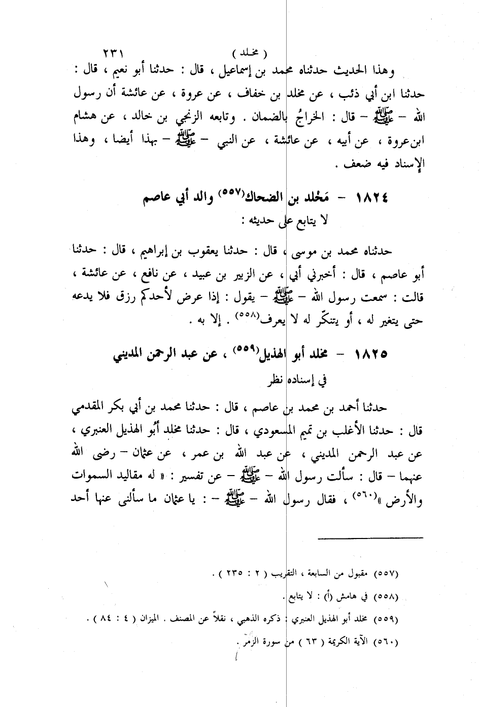 §1825 - مَخْلَدٌ أَبُو الْهُذَيْلِ عَنْ عَبْدِ الرَّحْمَنِ الْمَدِينِيِّ، فِي إِسْنَادِهِ نَظَرٌ