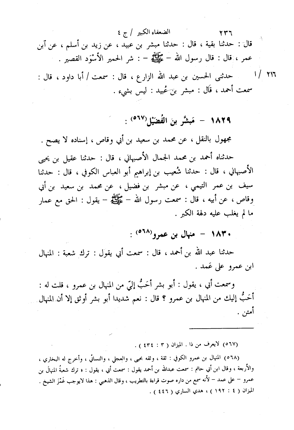 §1830 - مِنْهَالُ بْنُ عَمْرٍو حَدَّثَنَا عَبْدُ اللَّهِ بْنُ أَحْمَدَ قَالَ: سَمِعْتُ أَبِي يَقُولُ: تَرَكَ شُعْبَةُ الْمِنْهَالَ بْنَ عَمْرٍو عَلَى عَمْدٍ، وَسَمِعْتُ أَبِي يَقُولُ: أَبُو بِشْرٍ أَحَبُّ إِلَيَّ مِنَ الْمِنْهَالِ بْنِ عَمْرٍو , قُلْتُ لَهُ: أَحَبُّ إِلَيْكَ مِنَ الْمِنْهَالِ بْنِ عَمْرٍو؟ قَالَ: نَعَمْ شَدِيدًا , أَبُو بِشْرٍ أَوْثَقُ إِلَّا أَنَّ الْمِنْهَالَ أَمْتَنُ. حَدَّثَنَا مُحَمَّدُ بْنُ إِسْمَاعِيلَ قَالَ: حَدَّثَنَا مُحَمَّدُ بْنُ غَيْلَانَ قَالَ: حَدَّثَنَا وَهْبٌ، عَنْ شُعْبَةَ قَالَ: أَتَيْتُ مَنْزِلَ مِنْهَالِ بْنِ عَمْرٍو فَسَمِعْتُ مِنْهُ صَوْتَ الطُّنْبُورِ , فَرَجَعْتُ وَلَمْ أَسْأَلْهُ , قُلْتُ: وَهَلَّا سَأَلْتَهُ , فَعَسَى كَانَ لَا يَعْلَمُ