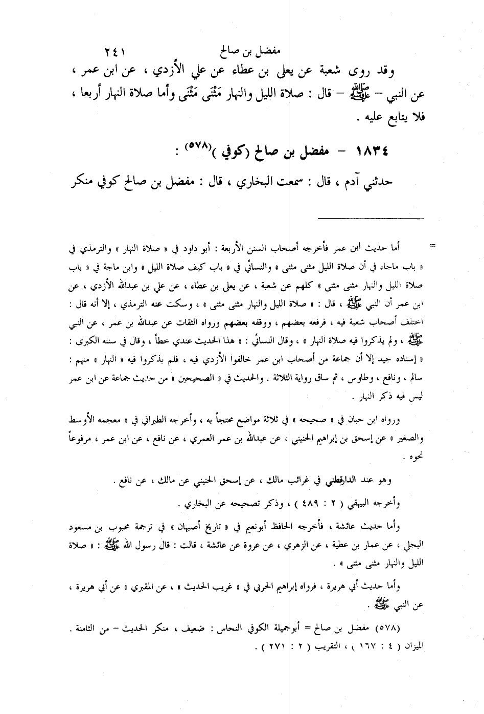 §1834 - مُفَضَّلُ بْنُ صَالِحٍ كُوفِيٌّ حَدَّثَنِي آدَمُ قَالَ: سَمِعْتُ الْبُخَارِيَّ قَالَ: مُفَضَّلُ بْنُ صَالِحٍ كُوفِيٌّ مُنْكَرُ الْحَدِيثِ , وَكَانَ نَخَّاسًا