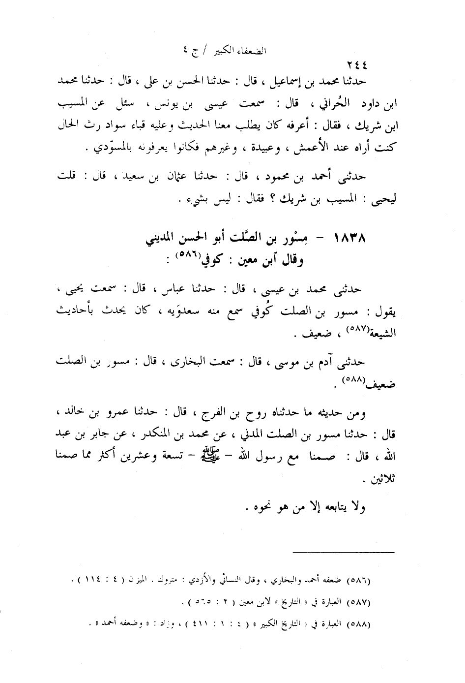 §1838 - مِسْوَرُ بْنُ الصَّلْتِ أَبُو الْحَسَنِ الْمَدِينِيُّ وَقَالَ ابْنُ مَعِينٍ: كُوفِيٌّ. حَدَّثَنِي مُحَمَّدُ بْنُ عِيسَى قَالَ: حَدَّثَنَا عَبَّاسٌ قَالَ: سَمِعْتُ يَحْيَى، يَقُولُ: مِسْوَرُ بْنُ الصَّلْتِ كُوفِيٌّ , سَمِعَ مِنْهُ، سَعْدَوَيْهِ , كَانَ يُحَدِّثُ بِأَحَادِيثَ الشِّيعَةِ , ضَعِيفٌ. حَدَّثَنِي آدَمُ بْنُ مُوسَى قَالَ: سَمِعْتُ الْبُخَارِيَّ قَالَ: مِسْوَرُ بْنُ الصَّلْتِ ضَعِيفٌ