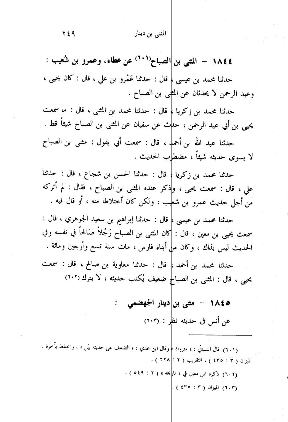 §1844 - الْمُثَنَّى بْنُ الصَّبَّاحِ عَنْ عَطَاءٍ، وَعَمْرِو بْنِ شُعَيْبٍ. حَدَّثَنَا مُحَمَّدُ بْنُ عِيسَى قَالَ: حَدَّثَنَا عَمْرُو بْنُ عَلِيٍّ قَالَ: كَانَ يَحْيَى وَعَبْدُ الرَّحْمَنِ لَا يُحَدِّثَانِ عَنِ الْمُثَنَّى بْنِ الصَّبَّاحِ. حَدَّثَنَا مُحَمَّدُ بْنُ زَكَرِيَّا قَالَ: حَدَّثَنَا مُحَمَّدُ بْنُ الْمُثَنَّى قَالَ: مَا سَمِعْتُ يَحْيَى بْنَ أَبِي عَبْدِ الرَّحْمَنِ، حَدَّثَ عَنْ سُفْيَانَ، عَنِ الْمُثَنَّى بْنِ الصَّبَّاحِ، شَيْئًا قَطُّ. حَدَّثَنَا عَبْدُ اللَّهِ بْنُ أَحْمَدَ قَالَ: سَمِعْتُ أَبِي يَقُولُ: مُثَنَّى بْنُ الصَّبَّاحِ لَا يَسْوَى حَدِيثُهُ شَيْئًا , مُضْطَرِبُ الْحَدِيثِ. حَدَّثَنَا مُحَمَّدُ بْنُ زَكَرِيَّا قَالَ: حَدَّثَنَا الْحَسَنُ بْنُ شُجَاعٍ قَالَ: حَدَّثَنَا عَلِيٌّ قَالَ: سَمِعْتُ يَحْيَى، وَذُكِرَ عِنْدَهُ الْمُثَنَّى بْنُ الصَّبَّاحِ , فَقَالَ: لَمْ أَتْرُكْهُ مِنْ أَجْلِ حَدِيثِ عَمْرِو بْنِ شُعَيْبٍ , وَلَكِنْ كَانَ اخْتِلَاطًا مِنْهُ , أَوْ قَالَ: فِيهِ. حَدَّثَنَا مُحَمَّدُ بْنُ عِيسَى قَالَ: حَدَّثَنَا إِبْرَاهِيمُ بْنُ سَعِيدٍ الْجَوْهَرِيُّ قَالَ: سَمِعْتُ يَحْيَى بْنَ مَعِينٍ قَالَ: كَانَ الْمُثَنَّى بْنُ الصَّبَّاحِ رَجُلًا صَالِحًا فِي نَفْسِهِ , وَفِي الْحَدِيثِ لَيْسَ بِذَاكَ , وَكَانَ مِنْ أَبْنَاءِ فَارِسَ , مَاتَ سَنَةَ تِسْعٍ وَأَرْبَعِينَ وَمِائَةٍ. حَدَّثَنَا مُحَمَّدُ بْنُ أَحْمَدَ قَالَ: حَدَّثَنَا مُعَاوِيَةُ بْنُ صَالِحٍ قَالَ: سَمِعْتُ يَحْيَى قَالَ: الْمُثَنَّى بْنُ الصَّبَّاحِ ضَعِيفٌ , يُكْتَبُ حَدِيثُهُ , لَا يُتْرَكُ