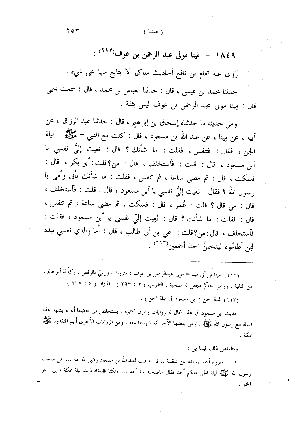§1849 - مِينَا مَوْلَى عَبْدِ الرَّحْمَنِ بْنِ عَوْفٍ رَوَى عَنْهُ، هَمَّامُ بْنُ نَافِعٍ أَحَادِيثَ مَنَاكِيرَ لَا يُتَابَعُ مِنْهَا عَلَى شَيْءٍ. حَدَّثَنَا مُحَمَّدُ بْنُ عِيسَى قَالَ: حَدَّثَنَا الْعَبَّاسُ بْنُ مُحَمَّدٍ قَالَ: سَمِعْتُ يَحْيَى قَالَ: مِينَا مَوْلَى عَبْدِ الرَّحْمَنِ بْنِ عَوْفٍ لَيْسَ بِثِقَةٍ