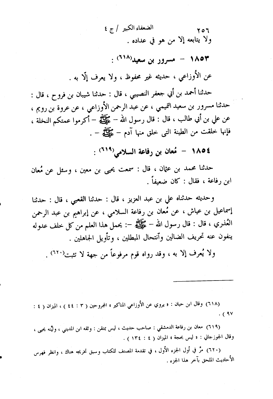 §1854 - مُعَانُ بْنُ رِفَاعَةَ السَّلَامِيُّ حَدَّثَنَا مُحَمَّدُ بْنُ عُثْمَانَ قَالَ: سَمِعْتُ يَحْيَى بْنَ مَعِينٍ، وَسُئِلَ عَنْ مُعَانِ بْنِ رِفَاعَةَ، فَقَالَ: كَانَ ضَعِيفًا