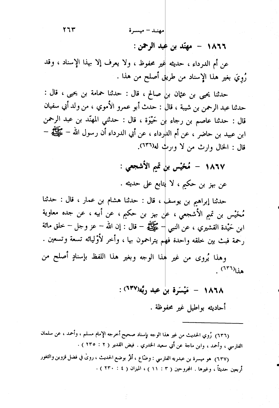 §1866 - مُهَنَّدُ بْنُ عَبْدِ الرَّحْمَنِ عَنْ أُمِّ الدَّرْدَاءِ، حَدِيثُهُ غَيْرُ مَحْفُوظٍ , وَلَا يُعْرَفُ إِلَّا بِهَذَا الْإِسْنَادِ , وَقَدْ رُوِيَ بِغَيْرِ هَذَا الْإِسْنَادِ مِنْ طَرِيقٍ أَصْلَحَ مِنْ هَذَا