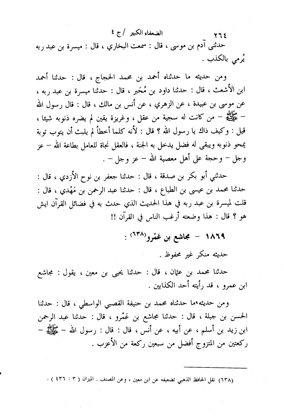 §1869 - مُجَاشِعُ بْنُ عَمْرٍو حَدِيثُهُ مُنْكَرٌ غَيْرُ مَحْفُوظٍ. حَدَّثَنَا مُحَمَّدُ بْنُ عُثْمَانَ قَالَ: حَدَّثَنَا يَحْيَى بْنُ مَعِينٍ، يَقُولُ مُجَاشِعُ بْنُ عَمْرٍو قَدْ رَأَيْتُهُ أَحَدَ الْكَذَّابِينَ