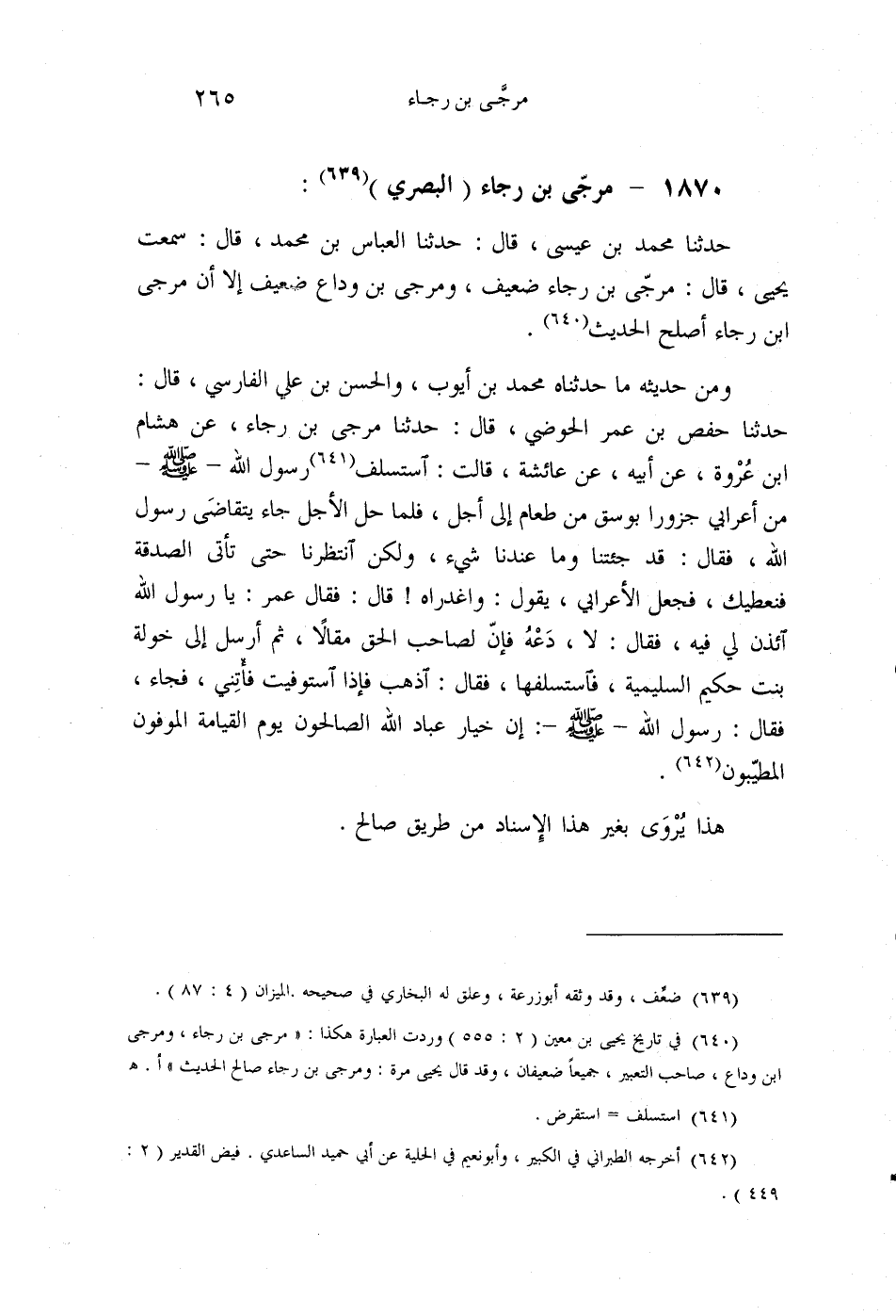 §1870 - مُرَجَّى بْنُ رَجَاءٍ الْبَصْرِيُّ حَدَّثَنَا مُحَمَّدُ بْنُ عِيسَى قَالَ: حَدَّثَنَا الْعَبَّاسُ بْنُ مُحَمَّدٍ قَالَ: سَمِعْتُ يَحْيَى قَالَ: مُرَجَّى بْنُ رَجَاءٍ ضَعِيفٌ , وَمُرَجَّى بْنُ وَدَاعٍ ضَعِيفٌ , إِلَّا أَنَّ مُرَجَّى بْنَ رَجَاءٍ، صَالِحُ الْحَدِيثِ