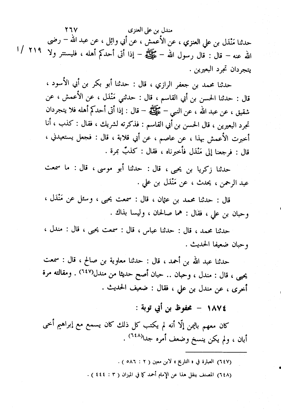 §1874 - مَحْفُوظُ بْنُ أَبِي تَوْبَةَ كَانَ مَعَهُمْ بِالْيَمَنِ إِلَّا أَنَّهُ لَمْ يَكْتُبْ كُلَّ ذَلِكَ , كَانَ يَسْمَعُ مَعَ إِبْرَاهِيمَ أَخِي أَبَانَ , وَلَمْ يَكُنْ يَنْسَخُ , وَضَعُفَ أَمْرُهُ جِدًّا