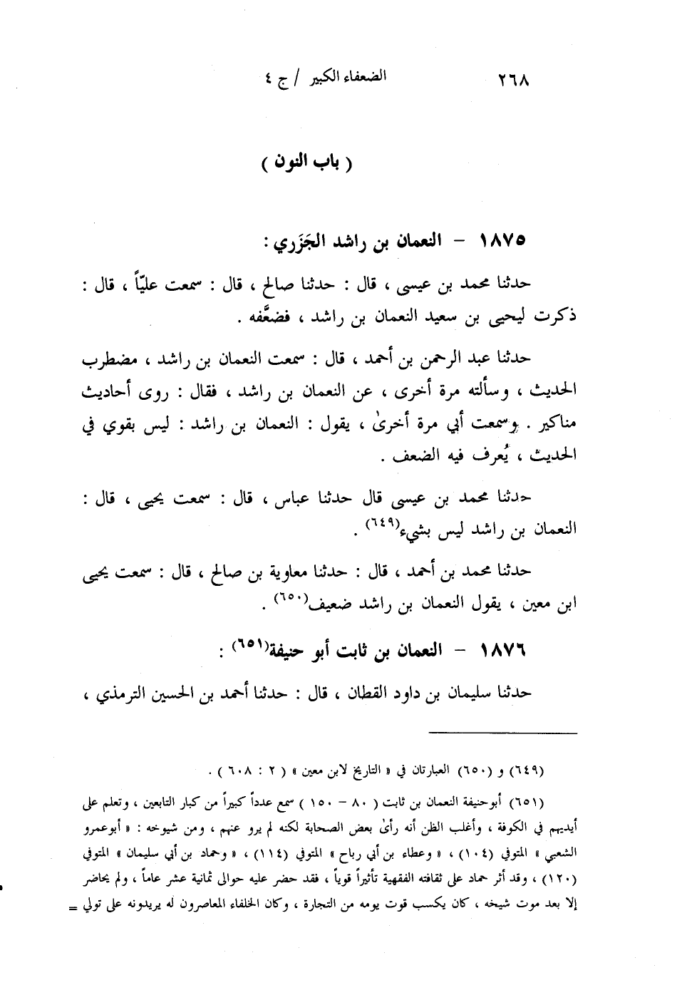 §1875 - النُّعْمَانُ بْنُ رَاشِدٍ الْجَزَرِيُّ حَدَّثَنَا مُحَمَّدُ بْنُ عِيسَى قَالَ: حَدَّثَنَا صَالِحٌ قَالَ: سَمِعْتُ عَلِيًّا قَالَ: ذَكَرْتُ لِيَحْيَى بْنِ سَعِيدٍ النُّعْمَانَ بْنَ رَاشِدٍ فَضَعَّفَهُ. حَدَّثَنَا عَبْدُ الرَّحْمَنِ بْنُ أَحْمَدَ قَالَ: سَمِعْتُ النُّعْمَانَ بْنَ رَاشِدٍ مُضْطَرِبُ الْحَدِيثِ , وَسَأَلْتُهُ مَرَّةً أُخْرَى عَنِ النُّعْمَانِ بْنِ رَاشِدٍ، فَقَالَ: رَوَى أَحَادِيثَ، مَنَاكِيرَ , وَسَمِعْتُ أَبِي مَرَّةً، أُخْرَى يَقُولُ: النُّعْمَانُ بْنُ رَاشِدٍ لَيْسَ بِقَوِيٍّ فِي الْحَدِيثِ , يُعْرَفُ فِيهِ الضَّعْفُ. حَدَّثَنَا مُحَمَّدُ بْنُ عِيسَى قَالَ: حَدَّثَنَا عَبَّاسٌ قَالَ: سَمِعْتُ يَحْيَى قَالَ: النُّعْمَانُ بْنُ رَاشِدٍ لَيْسَ بِشَيْءٍ. حَدَّثَنَا مُحَمَّدُ بْنُ أَحْمَدَ قَالَ: حَدَّثَنَا مُعَاوِيَةُ بْنُ صَالِحٍ قَالَ: سَمِعْتُ يَحْيَى بْنَ مَعِينٍ يَقُولُ: النُّعْمَانُ بْنُ رَاشِدٍ ضَعِيفٌ