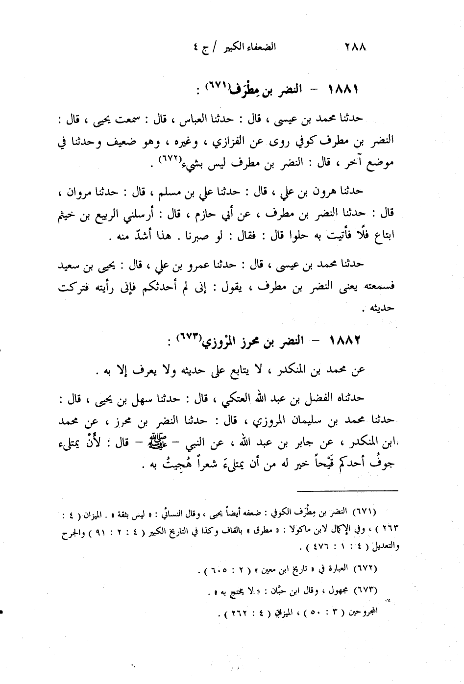 §1881 - النَّضْرُ بْنُ مُطَرِّفٍ حَدَّثَنَا مُحَمَّدُ بْنُ عِيسَى قَالَ: حَدَّثَنَا الْعَبَّاسُ قَالَ: سَمِعْتُ يَحْيَى قَالَ: النَّضْرُ بْنُ مُطَرِّفٍ كُوفِيٌّ رَوَى عَنِ الْفَزَارِيِّ وَغَيْرِهِ، وَهُوَ ضَعِيفٌ , وَحَدَّثَنَا فِي مَوْضِعٍ آخَرَ , قَالَ: النَّضْرُ بْنُ مُطَرِّفٍ لَيْسَ بِشَيْءٍ. حَدَّثَنَا هَارُونُ بْنُ عَلِيٍّ قَالَ: حَدَّثَنَا عَلِيُّ بْنُ مُسْلِمٍ قَالَ: حَدَّثَنَا مَرْوَانُ قَالَ: حَدَّثَنَا النَّضْرُ بْنُ مُطَرِّفٍ، عَنْ أَبِي حَازِمٍ قَالَ: أَرْسَلَنِي الرَّبِيعُ بْنُ خَيْثَمٍ أَبْتَاعُ خَلًّا , فَأَتَيْتُ بِهِ حُلْوًا , قَالَ: فَقَالَ: لَوْ صَبَرْنَا , هَذَا أَشَدُّ مِنْهُ. حَدَّثَنَا مُحَمَّدُ بْنُ عِيسَى قَالَ: حَدَّثَنَا عَمْرُو بْنُ عَلِيٍّ، قَالَ يَحْيَى بْنُ سَعِيدٍ: فَسَمِعْتُهُ يَعْنِي النَّضْرَ بْنَ مُطَرِّفٍ يَقُولُ: إِنِّي لَمْ أُحَدِّثْكُمْ , فَأُمِّي زَانِيَةٌ، فَتَرَكْتُ حَدِيثَهُ