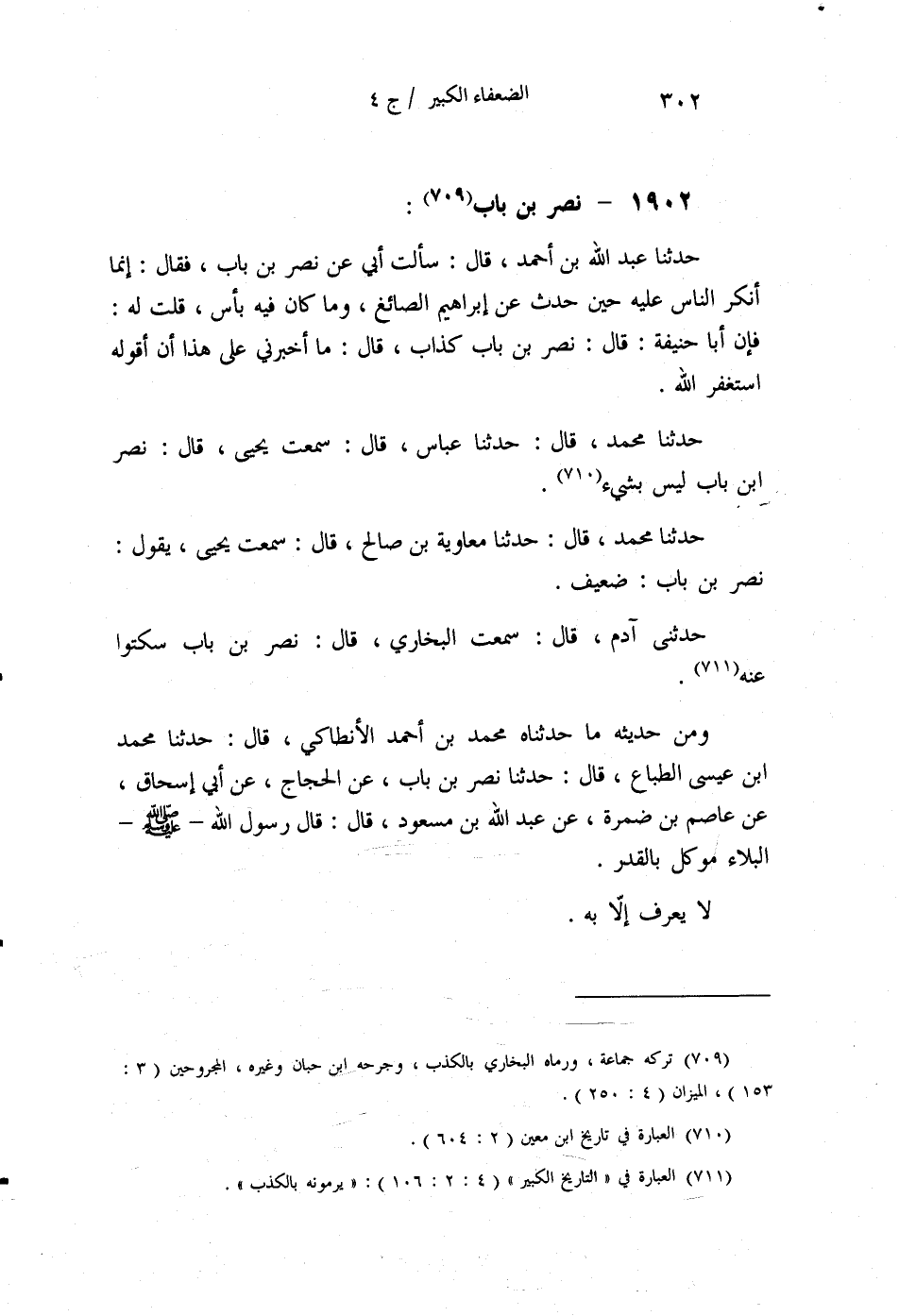 §1902 - نَصْرُ بْنُ بَابٍ حَدَّثَنَا عَبْدُ اللَّهِ بْنُ أَحْمَدَ قَالَ: سَأَلْتُ أَبِي عَنْ نَصْرِ بْنِ بَابٍ، فَقَالَ: إِنَّمَا أَنْكَرَ النَّاسُ عَلَيْهِ حِينَ حَدَّثَ عَنْ إِبْرَاهِيمَ الصَّائِغِ , وَمَا كَانَ فِيهِ بَأْسٌ , قُلْتُ لَهُ: فَإِنَّ أَبَا حَنِيفَةَ قَالَ: نَصْرُ بْنُ بَابٍ كَذَّابٌ , قَالَ: مَا أَخْبَرَنِي عَلَى هَذَا أَنْ أَقُولَهُ اسْتَغْفِرِ اللَّهَ. حَدَّثَنَا مُحَمَّدٌ قَالَ: حَدَّثَنَا عَبَّاسٌ قَالَ: سَمِعْتُ يَحْيَى قَالَ: نَصْرُ بْنُ بَابٍ لَيْسَ بِشَيْءٍ. حَدَّثَنَا مُحَمَّدٌ قَالَ: حَدَّثَنَا مُعَاوِيَةُ بْنُ صَالِحٍ قَالَ: سَمِعْتُ يَحْيَى، يَقُولُ: نَصْرُ بْنُ بَابٍ ضَعِيفٌ. حَدَّثَنِي آدَمُ قَالَ: سَمِعْتُ الْبُخَارِيَّ قَالَ: نَصْرُ بْنُ بَابٍ سَكَتُوا عَنْهُ