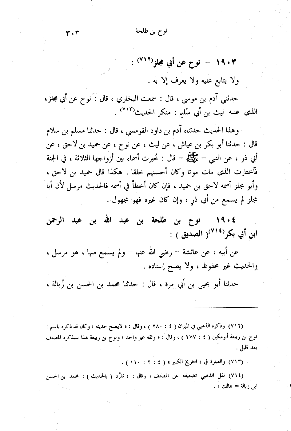 §1904 - نُوحُ بْنُ طَلْحَةَ بْنِ عَبْدِ اللَّهِ بْنِ عَبْدِ الرَّحْمَنِ بْنِ أَبِي بَكْرٍ الصِّدِّيقِ عَنْ أَبِيهِ، عَنْ عَائِشَةَ، رَضِيَ اللَّهُ عَنْهَا , وَلَمْ يَسْمَعْ مِنْهَا , هُوَ مُرْسَلٌ , وَالْحَدِيثُ غَيْرُ مَحْفُوظٍ وَلَا يَصِحُّ إِسْنَادُهُ