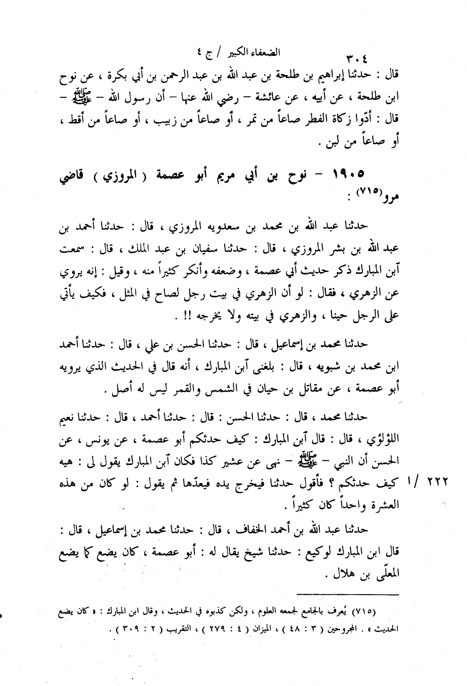 §1905 - نُوحُ بْنُ أَبِي مَرْيَمَ أَبُو عِصْمَةَ الْمَرْوَزِيُّ قَاضِي مَرْوَ. حَدَّثَنَا عَبْدُ اللَّهِ بْنُ مُحَمَّدِ بْنِ سَعْدَوَيْهِ الْمَرْوَزِيُّ قَالَ: حَدَّثَنَا أَحْمَدُ بْنُ عَبْدِ اللَّهِ بْنِ بِشْرٍ الْمَرْوَزِيُّ قَالَ: حَدَّثَنَا سُفْيَانُ بْنُ عَبْدِ الْمَلِكِ قَالَ: سَمِعْتُ ابْنَ الْمُبَارَكِ، ذَكَرَ حَدِيثَ أَبِي عِصْمَةَ , وَضَعَّفَهُ وَأَنْكَرَ كَثِيرًا مِنْهُ , وَقِيلَ: إِنَّهُ يَرْوِي عَنِ الزُّهْرِيِّ , فَقَالَ: لَوْ أَنَّ الزُّهْرِيَّ فِي بَيْتِ رَجُلٍ لَصَاحَ فِي الْمِثْلِ , فَكَيْفَ يَأْتِي عَلَى الرَّجُلِ حِينًا وَالزُّهْرِيُّ فِي بَيْتِهِ وَلَا يُخْرِجُهُ. حَدَّثَنَا مُحَمَّدُ بْنُ إِسْمَاعِيلَ قَالَ: حَدَّثَنَا الْحَسَنُ بْنُ عَلِيٍّ قَالَ: حَدَّثَنَا أَحْمَدُ بْنُ مُحَمَّدِ بْنِ شَبُّوَيْهِ قَالَ: بَلَّغَنِي ابْنُ الْمُبَارَكِ أَنَّهُ قَالَ فِي الْحَدِيثِ الَّذِي يَرْوِيهِ: أَبُو عِصْمَةَ , عَنْ مُقَاتِلِ بْنِ حَيَّانَ فِي الشَّمْسِ وَالْقَمَرِ: لَيْسَ لَهُ أَصْلٌ. حَدَّثَنَا مُحَمَّدٌ قَالَ: حَدَّثَنَا الْحَسَنُ قَالَ: حَدَّثَنَا أَحْمَدُ قَالَ: حَدَّثَنَا نُعَيْمٌ اللُّؤْلُؤِيُّ قَالَ: قَالَ ابْنُ الْمُبَارَكِ: كَيْفَ حَدَّثَكُمْ أَبُو عِصْمَةَ، عَنْ يُونُسَ، عَنِ الْحَسَنِ، أَنَّ النَّبِيَّ صَلَّى اللهُ عَلَيْهِ وَسَلَّمَ , نَهَيَ عَنْ عُشَيْرِ كَذَا؟ فَكَانَ ابْنُ الْمُبَارَكِ يَقُولُ لِي: هِيهِ كَيْفَ حَدَّثَكُمْ؟ فَأَقُولُ: حَدَّثَنَا فَيُخْرِجُ يَدَهُ , فَيَعُدُّهَا ثُمَّ يَقُولُ: لَوْ كَانَ مِنْ هَذِهِ الْعَشَرَةِ وَاحِدٌ كَانَ كَثِيرًا. حَدَّثَنَا عَبْدُ اللَّهِ بْنُ أَحْمَدَ الْخَفَّافُ، قَالَ: حَدَّثَنَا مُحَمَّدُ بْنُ إِسْمَاعِيلَ قَالَ: قَالَ ابْنُ الْمُبَارَكِ لِوَكِيعٍ: حَدَّثَنَا شَيْخٌ، يُقَالُ لَهُ أَبُو عِصْمَةَ , كَانَ يَضَعُ كَمَا يَضَعُ الْمُعَلَّى بْنُ هِلَالٍ. وَحَدَّثَنَا عَبْدُ اللَّهِ قَالَ: سَمِعْتُ أَبِي يَقُولُ: كَانَ أَبُو عِصْمَةَ يَرْوِي أَحَادِيثَ مَنَاكِيرَ , وَلَمْ يَكُنْ فِي الْحَدِيثِ بِذَاكَ. حَدَّثَنِي آدَمُ بْنُ مُوسَى قَالَ: سَمِعْتُ الْبُخَارِيَّ قَالَ: نُوحُ بْنُ أَبِي مَرْيَمَ ذَاهِبُ الْحَدِيثِ جِدًّا. حَدَّثَنِي عَبْدُ اللَّهِ بْنُ مُحَمَّدٍ، عَنْ رَقِبٍ الْمِصْرِيِّ قَالَ: حَدَّثَنِي إِسْحَاقُ بْنُ الْحَسَنِ الطَّحَّانُ قَالَ: سَمِعْتُ نُعَيْمَ بْنَ حَمَّادٍ، سَأَلَ ابْنَ الْمُبَارَكِ عَنْ نُوحِ بْنِ أَبِي مَرْيَمَ، فَقَالَ: هُوَ يَقُولُ لَا إِلَهَ إِلَّا اللَّهُ