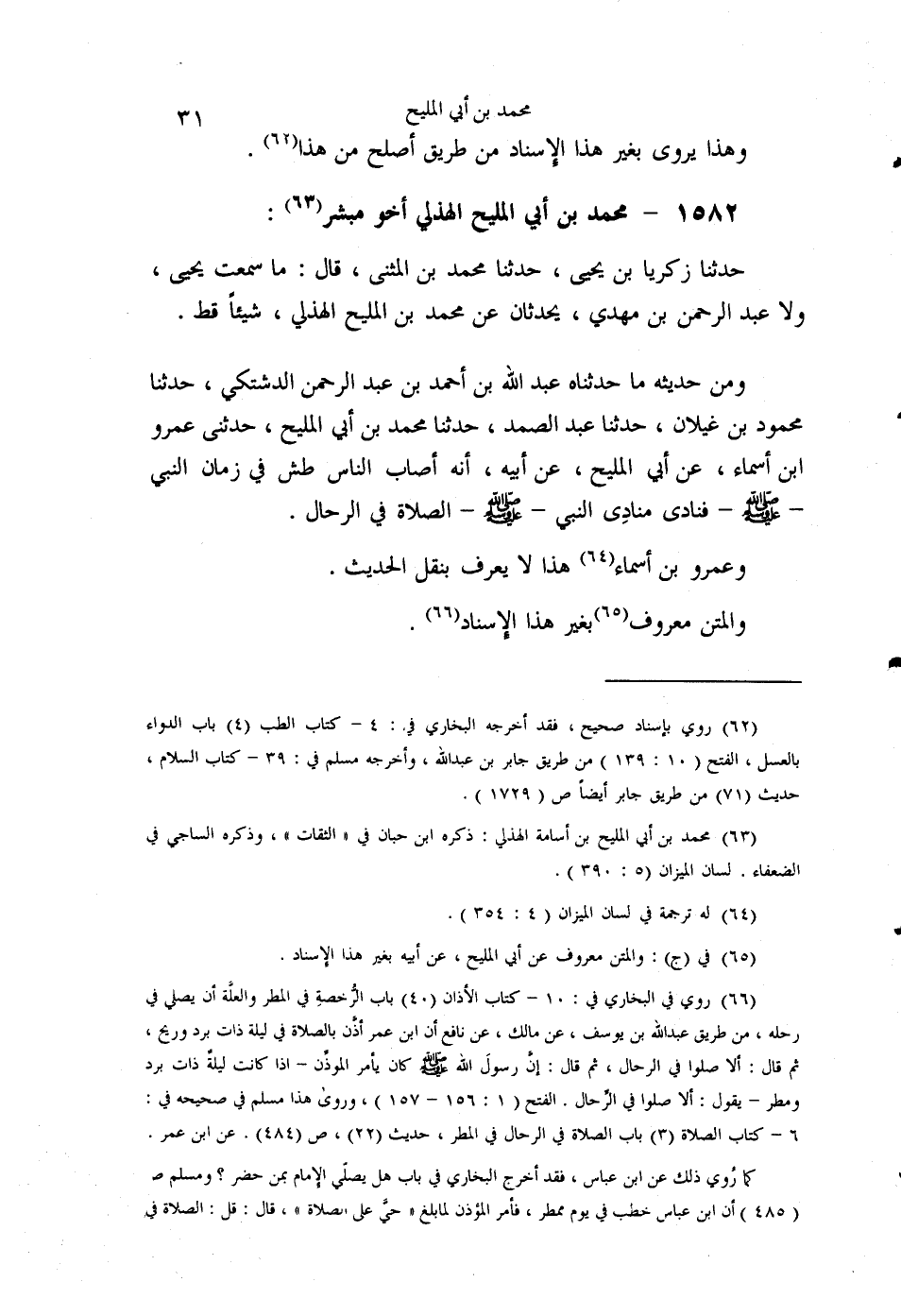 §1582 - مُحَمَّدُ بْنُ أَبِي الْمَلِيحِ الْهُذَلِيُّ أَخُو مُبَشِّرٍ. حَدَّثَنَا زَكَرِيَّا بْنُ يَحْيَى، حَدَّثَنَا مُحَمَّدُ بْنُ الْمُثَنَّى قَالَ: مَا سَمِعْتُ يَحْيَى، وَلَا عَبْدَ الرَّحْمَنِ بْنَ مَهْدِيٍّ يُحَدِّثَانِ , عَنْ مُحَمَّدِ بْنِ أَبِي الْمَلِيحِ الْهُذَلِيِّ شَيْئًا قَطُّ