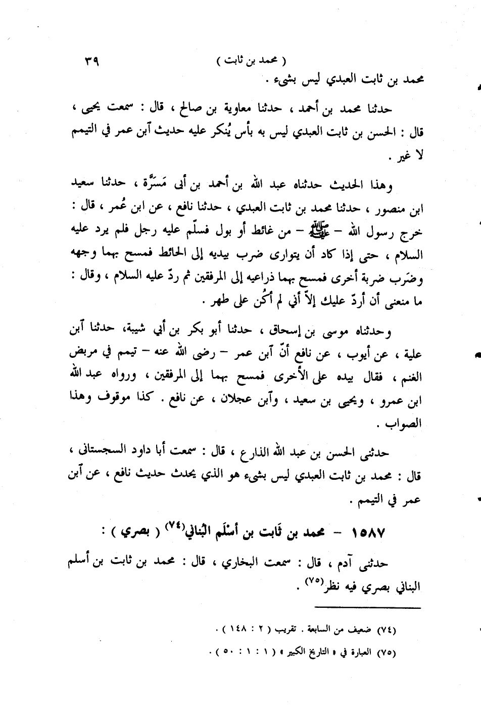 §1587 - مُحَمَّدُ بْنُ ثَابِتِ بْنِ أَسْلَمَ الْبُنَانِيُّ , بَصْرِيٌّ حَدَّثَنِي آدَمُ قَالَ: سَمِعْتُ الْبُخَارِيَّ قَالَ: مُحَمَّدُ بْنُ ثَابِتِ بْنِ أَسْلَمَ الْبُنَانِيُّ بَصْرِيٌّ فِيهِ نَظَرٌ. حَدَّثَنَا مُحَمَّدُ بْنُ عِيسَى، حَدَّثَنَا عَبَّاسٌ قَالَ: وَحَدَّثَنَا مُحَمَّدُ بْنُ أَحْمَدَ، حَدَّثَنَا مُعَاوِيَةُ بْنُ صَالِحٍ قَالَ: سَمِعْنَا يَحْيَى بْنَ مَعِينٍ يَقُولُ: قَالَ: مُحَمَّدُ بْنُ ثَابِتٍ الْبُنَانِيُّ لَيْسَ بِشَيْءٍ