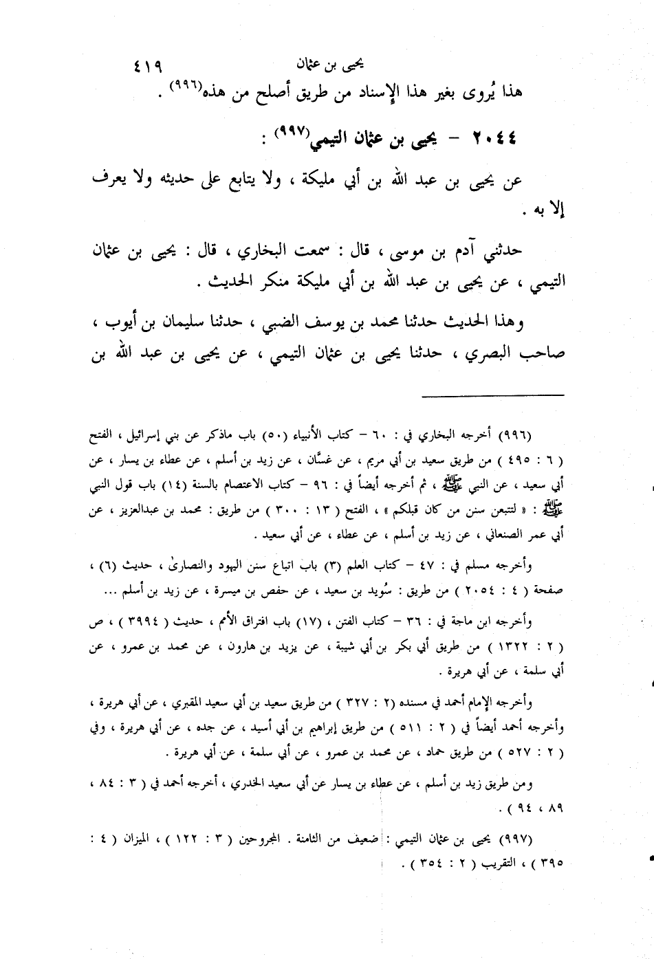 §2044 - يَحْيَى بْنُ عُثْمَانَ التَّيْمِيُّ عَنْ يَحْيَى بْنِ عَبْدِ اللَّهِ بْنِ أَبِي مُلَيْكَةَ، وَلَا يُتَابَعُ عَلَى حَدِيثِهِ , وَلَا يُعْرَفُ إِلَّا بِهِ. حَدَّثَنِي آدَمُ بْنُ مُوسَى قَالَ: سَمِعْتُ الْبُخَارِيَّ قَالَ: يَحْيَى بْنُ عُثْمَانَ التَّيْمِيُّ , عَنْ حُيَيِّ بْنِ عَبْدِ اللَّهِ بْنِ أَبِي مُلَيْكَةَ مُنْكَرُ الْحَدِيثِ