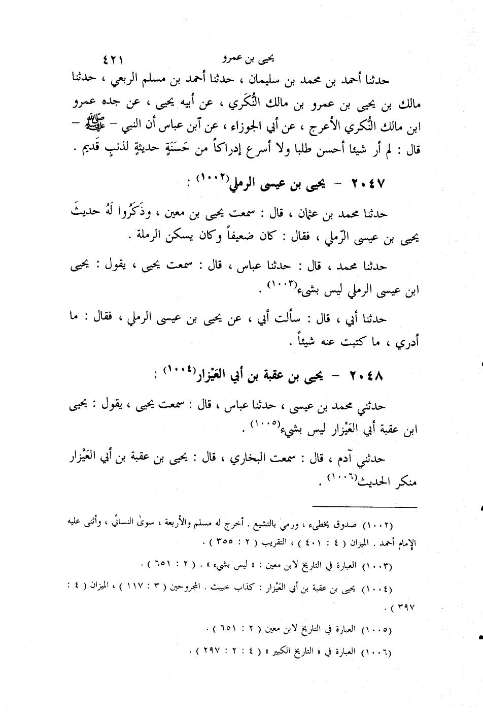 §2047 - يَحْيَى بْنُ عِيسَى الرَّمْلِيُّ حَدَّثَنَا مُحَمَّدُ بْنُ عُثْمَانَ قَالَ: سَمِعْتُ يَحْيَى بْنَ مَعِينٍ، وَذَكَرُوا لَهُ حَدِيثَ يَحْيَى بْنِ عِيسَى الرَّمْلِيِّ , فَقَالَ: كَانَ ضَعِيفًا وَكَانَ يَسْكُنُ الرَّمْلَةَ. حَدَّثَنَا مُحَمَّدٌ قَالَ: حَدَّثَنَا عَبَّاسٌ قَالَ: سَمِعْتُ يَحْيَى، يَقُولُ: يَحْيَى بْنُ عِيسَى الرَّمْلِيُّ لَيْسَ بِشَيْءٍ. حَدَّثَنَا أَبِي قَالَ: سَأَلْتُ أَبِي عَنْ يَحْيَى بْنِ عِيسَى الرَّمْلِيِّ، فَقَالَ: مَا أَدْرِي , مَا كَتَبْتُ عَنْهُ شَيْئًا