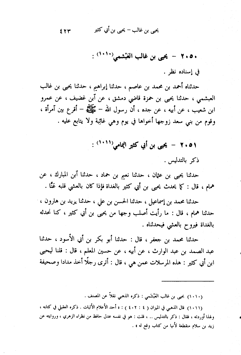 §2051 - يَحْيَى بْنُ أَبِي كَثِيرٍ الْيَمَامِيُّ ذُكِرَ بِالتَّدْلِيسِ. حَدَّثَنَا يَحْيَى بْنُ عُثْمَانَ، حَدَّثَنَا نُعَيْمُ بْنُ حَمَّادٍ، حَدَّثَنَا ابْنُ الْمُبَارَكِ، عَنْ هَمَّامٍ قَالَ: كَمَا يُحَدِّثُ يَحْيَى بْنُ أَبِي كَثِيرٍ بِالْغَدَاةِ , فَإِذَا كَانَ بِالْعَشِيِّ قَلَبَهُ عَنَّا. حَدَّثَنَا مُحَمَّدُ بْنُ إِسْمَاعِيلَ، حَدَّثَنَا الْحَسَنُ بْنُ عَلِيٍّ، حَدَّثَنَا يَزِيدُ بْنُ هَارُونَ، حَدَّثَنَا هَمَّامٌ قَالَ: مَا رَأَيْتُ أَصْلَبَ وَجْهًا مِنْ يَحْيَى بْنِ أَبِي كَثِيرٍ , كُنَّا نُحَدِّثُهُ بِالْغَدَاةِ , فَيَرُوحُ بِالْعَشِيِّ فَيُحَدِّثْنَاهُ. حَدَّثَنَا مُحَمَّدُ بْنُ جَعْفَرٍ قَالَ: حَدَّثَنَا أَبُو بَكْرِ بْنُ أَبِي الْأَسْوَدِ، حَدَّثَنَا عَبْدُ الصَّمَدِ بْنُ عَبْدِ الْوَارِثِ، عَنْ أَبِيهِ، عَنْ حُسَيْنٍ الْمُعَلِّمِ قَالَ: قُلْنَا لِيَحْيَى بْنِ أَبِي كَثِيرٍ: هَذِهِ الْمُرْسَلَاتُ عَمَّنْ هِيَ؟ قَالَ: أَتَرَى رَجُلًا أَخَذَ مِدَادًا وَصَحِيفَةً فَكَتَبَ عَلَى رَسُولِ اللَّهِ صَلَّى اللهُ عَلَيْهِ وَسَلَّمَ الْكَذِبَ , قَالَ: قُلْتُ: فَإِذَا جَاءَ مِثْلُ هَذَا فَأَخْبَرَنَا , قَالُ: إِذَا قُلْتُ بَلَغَنِي فَإِنَّهُ مِنَ الْكِتَابِ , قَالَ أَبُو بَكْرٍ , وَقَالَ يَحْيَى بْنُ سَعِيدٍ: مُرْسَلَاتُ يَحْيَى بْنِ أَبِي كَثِيرٍ شِبْهُ الرِّيحِ. حَدَّثَنَا مُحَمَّدُ بْنُ عِيسَى قَالَ: حَدَّثَنَا عَمْرُو بْنُ عَلِيٍّ قَالَ: مَا حَدَّثَنَا يَحْيَى، عَنْ قَتَادَةَ بِشَيْءٍ مُرْسَلٍ , وَلَا عَنْ يَحْيَى بْنِ أَبِي كَثِيرٍ بِمُرْسَلٍ وَلَا حَدِيثٍ وَاحِدٍ , فَحَدَّثَنَا عَنِ الْأَوْزَاعِيِّ، عَنْ يَحْيَى بْنِ أَبِي كَثِيرٍ، أَنَّ ابْنَ عَبَّاسٍ، كَانَ لَا يَرَى طَلَاقَ الْمُكْرَهِ شَيْئًا , وَكَانَ عَبْدُ الرَّحْمَنِ يُحَدِّثُنَا عَنْهُمَا جَمِيعًا بِمُرْسَلِهِ. حَدَّثَنَا يَحْيَى قَالَ: حَدَّثَنَا نُعَيْمٌ، حَدَّثَنَا عَبْدُ الصَّمَدِ، عَنْ أَبِيهِ، عَنْ حُسَيْنٍ الْمُعَلِّمِ قَالَ: قُلْنَا لِيَحْيَى بْنِ أَبِي كَثِيرٍ: إِنَّكَ تَحَدِّثُنَا عَنْ قَوْمٍ، لَمْ تَلْقَهُمْ وَلَمْ تَسْمَعْ مِنْهُمْ , قَالَ: تَرَوْنَ الْكِتَابَ وُضِعَ فِي الْقِرْطَاسِ وَالدَّوَاةِ , فَكُتِبَ فِيهِ الْكَذِبُ , فَقُلْتُ: لَا تَفْعَلْ