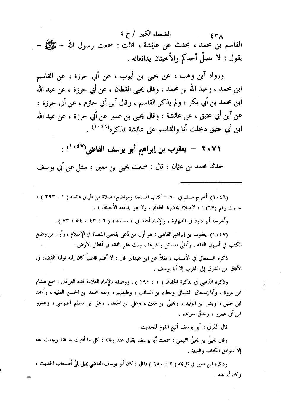 §2071 - يَعْقُوبُ بْنُ إِبْرَاهِيمَ أَبُو يُوسُفَ الْقَاضِي حَدَّثَنَا مُحَمَّدُ بْنُ عُثْمَانَ قَالَ: سَمِعْتُ يَحْيَى بْنَ مَعِينٍ سُئِلَ عَنْ أَبِي يُوسُفَ -[439]- الْقَاضِي، فَقَالَ: لَمْ يَكُنْ يَعْرِفُ الْحَدِيثَ. حَدَّثَنَا مُحَمَّدُ بْنُ زَكَرِيَّا، حَدَّثَنَا أَبُو مُوسَى مُحَمَّدُ بْنُ الْمُثَنَّى قَالَ: مَا سَمِعْتُ -[440]- عَبْدَ الرَّحْمَنِ، يُحَدِّثُ عَنْ أَبِي يُوسُفَ، شَيْئًا قَطُّ. حَدَّثَنَا مُحَمَّدُ بْنُ زَكَرِيَّا الْبَلْخِيُّ، حَدَّثَنَا سَعِيدُ بْنُ يَعْقُوبَ الطَّالْقَانِيُّ، عَنِ ابْنِ الْمُبَارَكِ، أَنَّهُ قِيلَ لَهُ: أَيُّ الرَّجُلَيْنِ أَفْقَهُ أَبُو يُوسُفَ أَوْ مُحَمَّدُ بْنُ الْحَسَنِ؟ فَقَالَ: لَا تَقُلْ كَانَ أَيُّهُمَا. حَدَّثَنَا أَحْمَدُ بْنُ عَلِيٍّ، حَدَّثَنَا مَحْمُودُ بْنُ غَيْلَانَ قَالَ: قُلْتُ لِيَزِيدَ بْنِ هَارُونَ: مَا تَقُولُ فِي أَبِي يُوسُفَ؟ قَالَ: لَا يَحِلُّ الرِّوَايَةُ عَنْهُ , إِنَّهُ كَانَ يُعْطَى أَمْوَالَ الْيَتَامَى مُضَارَبَةً وَيَجْعَلُ الرِّبْحَ لِنَفْسِهِ. حَدَّثَنَا مُحَمَّدُ بْنُ زَكَرِيَّا، حَدَّثَنَا أَبُو سَعِيدٍ الْأَشَجُّ قَالَ: سَمِعْتُ أَبَا نُعَيْمٍ يَقُولُ: كُنْتُ عِنْدَ أَبِي حَنِيفَةَ , وَدَخَلَ عَلَيْهِ أَبُو يُوسُفَ , فَقَالَ: يَا يَعْقُوبُ تُدْخِلُ فِي كُتُبِي مَا لَمْ أَقُلْ. حَدَّثَنَا مُحَمَّدُ بْنُ حَاتِمٍ، حَدَّثَنَا حُسْبَانُ بْنُ مُوسَى قَالَ: سَمِعْتُ ابْنَ الْمُبَارَكِ، يَقُولُ: إِنِّي لَأَسْتَثْقِلُ مَجْلِسًا فِيهِ ذِكْرُ أَبِي يُوسُفَ. حَدَّثَنِي الْهَيْثَمُ بْنُ خَلَفٍ، حَدَّثَنَا عَبْدُ اللَّهِ بْنُ أَحْمَدَ بْنِ شَبُّوَيْهِ قَالَ: سَمِعْتُ أَبَا رَجَاءٍ قَالَ: قِيلَ لِعَبْدِ اللَّهِ بْنِ الْمُبَارَكِ بِالرَّيِّ: قَالَ أَبُو يُوسُفَ , قَالَ: لَا , وَلَا كَرَامَةَ، قُلْ يَعْقُوبُ. حَدَّثَنَا مُعَاذُ بْنُ الْمُثَنَّى، حَدَّثَنَا رَجَاءُ بْنُ السِّنْدِيِّ قَالَ: سَمِعْتُ عَبْدَ اللَّهِ بْنَ إِدْرِيسَ، يَقُولُ: كَانَ أَبُو حَنِيفَةَ ضَالًّا مُضِلًّا , وَأَبُو يُوسُفَ فَاسِقًا مِنَ الْفَاسِقِينَ -[441]-. حَدَّثَنَا جَعْفَرُ بْنُ مُحَمَّدٍ الْفِرْيَابِيُّ قَالَ: حَدَّثَنَا إِسْحَاقُ بْنُ رَاهَوَيْهِ قَالَ: سَمِعْتُ يَحْيَى بْنَ آدَمَ يَقُولُ: شَهِدَ أَبُو يُوسُفَ عِنْدَ شَرِيكٍ فَرَدَّ شَهَادَتَهُ , فَقُلْتُ لَهُ: رَدَدْتَ شَهَادَةَ أَبِي يُوسُفَ؟ , قَالَ: لَا، أَرُدُّ شَهَادَةَ مَنْ يَزْعُمُ أَنَّ الصَّلَاةَ لَيْسَتْ مِنَ الْإِيمَانِ؟ . حَدَّثَنَا الْهَيْثَمُ بْنُ خَلَفٍ قَالَ: حَدَّثَنَا عَبْدُ اللَّهِ بْنُ شَبُّوَيْهِ، حَدَّثَنَا أَبِي، حَدَّثَنَا الْقَاسِمُ بْنُ خَالِدٍ قَالَ: جَلَسْنَا إِلَى الْفُضَيْلِ بْنِ عِيَاضٍ يَوْمًا , فَقُلْتُ لَهُ: يَا أَبَا عَلِيٍّ , مَا تَقُولُ فِي عِلْمِ أَبِي يُوسُفَ؟ قَالَ: أَوَعِلْمٌ هُوَ؟ انْظُرْ إِلَيْهِ مَاذَا يَصْنَعُ بِهِ عِلْمُهُ. حَدَّثَنَا الْهَيْثَمُ بْنُ خَلَفٍ، حَدَّثَنَا أَحْمَدُ بْنُ عُثْمَانَ بْنِ حَكِيمٍ قَالَ: سَمِعْتُ عَبْدَ الرَّزَّاقِ بْنَ عُمَرَ الرَّبَعِيَّ قَالَ: كُنْتُ عِنْدَ عَبْدِ اللَّهِ بْنِ الْمُبَارَكِ , فَسَأَلَهُ رَجُلٌ عَنْ مَسْأَلَةٍ , فَأَجَابَهُ ابْنُ الْمُبَارَكِ , فَقَالَ لَهُ رَجُلٌ: قَدْ سَأَلْتُ أَبَا يُوسُفَ , فَخَالَفَكَ فِيهَا , فَقَالَ لَهُ ابْنُ الْمُبَارَكِ: إِنْ كُنْتَ صَلَّيْتَ خَلْفَ أَبِي يُوسُفَ فَانْظُرْ صَلَاتَكَ. حَدَّثَنِي الْهَيْثَمُ بْنُ خَلَفٍ، حَدَّثَنَا عَبْدُ اللَّهِ بْنُ أَحْمَدَ بْنِ شَبُّوَيْهِ قَالَ: سَمِعْتُ أَبَا رَجَاءٍ قُتَيْبَةَ بْنَ سَعِيدٍ يَذْكُرُ عَنْ مَعْنِ بْنِ عِيسَى قَالَ: دَخَلَ مَالِكُ بْنُ أَنَسٍ عَلَى أَمِيرِ الْمُؤْمِنِينَ هَارُونَ وَهُوَ بِالْمَدِينَةِ وَمَعَهُ أَبُو يُوسُفَ , قَالَ: فَ
