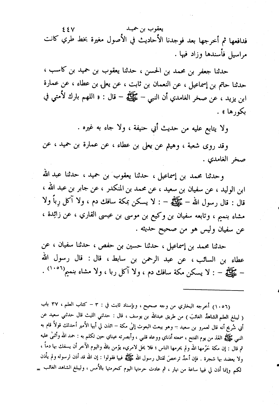 حَدَّثَنَا جَعْفَرُ بْنُ مُحَمَّدِ بْنِ الْحَسَنِ، حَدَّثَنَا يَعْقُوبُ بْنُ حُمَيْدِ بْنِ كَاسِبٍ، حَدَّثَنَا حَاتِمُ بْنُ إِسْمَاعِيلَ، عَنِ النُّعْمَانِ بْنِ ثَابِتٍ، عَنْ يَعْلَى بْنِ عَطَاءٍ، عَنْ عُمَارَةَ بْنِ يَزِيدَ، عَنْ صَخْرٍ الْغَامِدِيِّ، أَنَّ النَّبِيَّ صَلَّى اللهُ عَلَيْهِ وَسَلَّمَ , قَالَ: §«اللَّهُمَّ بَارِكْ لِأُمَّتِي فِي بُكُورِهَا» . وَلَا يُتَابَعُ عَلَيْهِ مِنْ حَدِيثِ أَبِي حَنِيفَةَ وَلَا جَاءَ بِهِ غَيْرُهُ. وَقَدْ رَوَى شُعْبَةُ، وَهُشَيْمٌ، عَنْ يَعْلَى بْنِ عَطَاءٍ , عَنْ عُمَارَةَ بْنِ حُمَيْدٍ، عَنْ صَخْرٍ الْغَامِدِيِّ