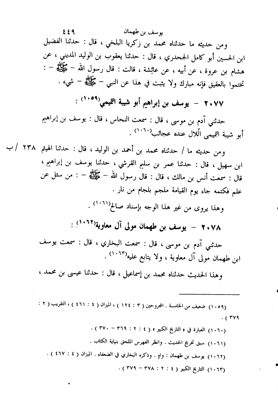 §2078 - يُوسُفُ بْنُ طَهْمَانَ مَوْلَى آلِ مُعَاوِيَةَ. حَدَّثَنِي آدَمُ بْنُ مُوسَى قَالَ: سَمِعْتُ الْبُخَارِيَّ قَالَ: سَمِعْتُ يُوسُفَ بْنَ طَهْمَانَ، مَوْلَى آلِ مُعَاوِيَةَ , وَلَا يُتَابَعُ عَلَيْهِ
