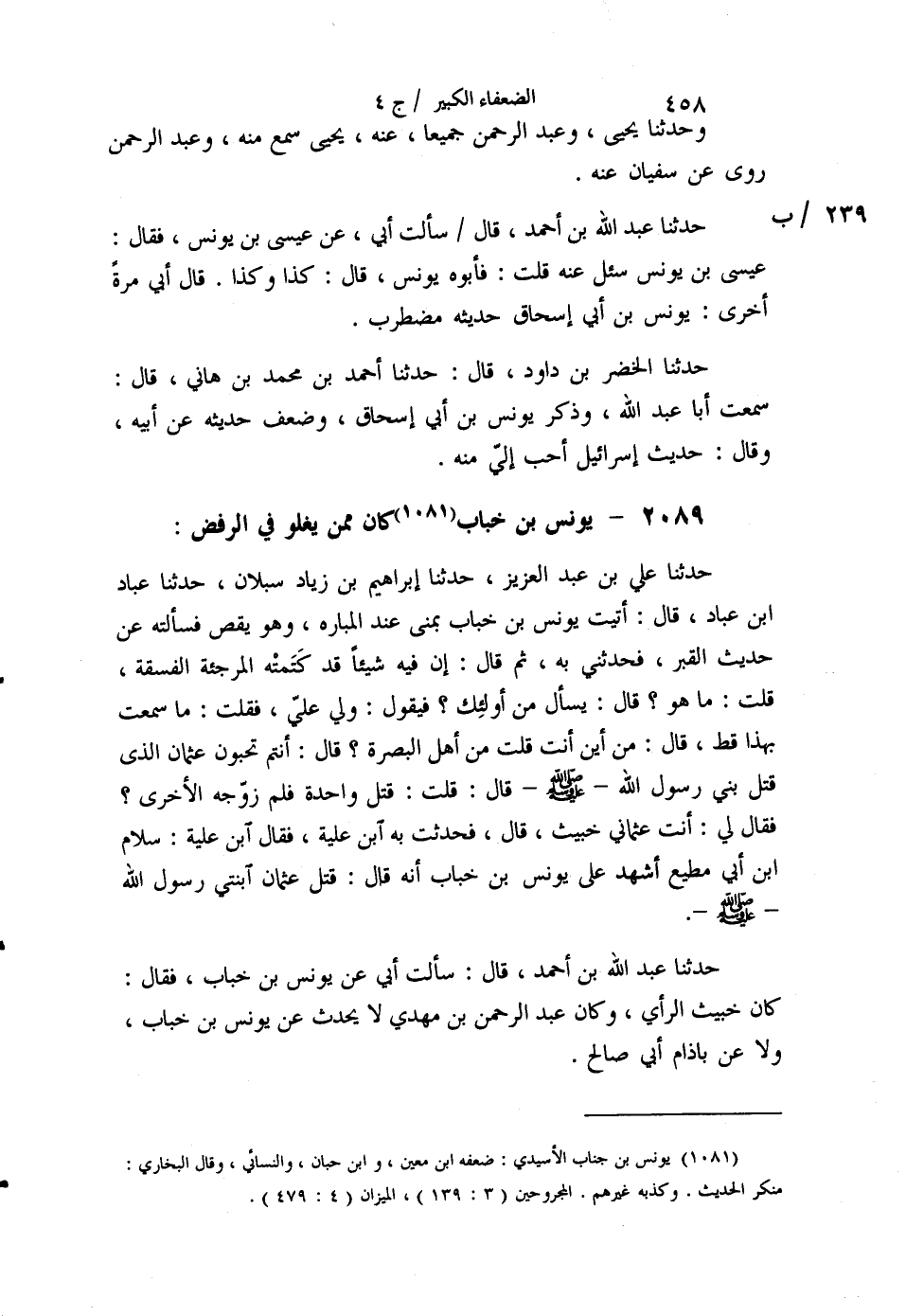 §2089 - يُونُسُ بْنُ خَبَّابٍ كَانَ مِمَّنْ يَغْلُو فِي الرَّفْضِ. حَدَّثَنَا عَلِيُّ بْنُ عَبْدِ الْعَزِيزِ، حَدَّثَنَا إِبْرَاهِيمُ بْنُ زِيَادٍ سَبَلَانَ , حَدَّثَنَا عَبَّادُ بْنُ عَبَّادٍ قَالَ: أَتَيْتُ يُونُسَ بْنَ خَبَّابٍ بِمِنًى عِنْدَ الْمَبَارِهِ , وَهُوَ يَقُصُّ , فَسَأَلْتُهُ عَنْ حَدِيثِ الْقَبْرِ , فَحَدَّثَنِي بِهِ , ثُمَّ قَالَ: إِنَّ فِيهِ شَيْئًا قَدْ كَتَمَتْهُ الْمُرْجِئَةُ الْفَسَقَةُ , قُلْتُ: مَا هُوَ؟ قَالَ: يُسْأَلُ مَنْ أُولَئِكَ؟ فَيَقُولُ: وَلِيَ عَلِيٌّ , فَقُلْتُ مَا سَمِعْتُ بِهَذَا قَطُّ , قَالَ: مِنْ أَيْنَ أَنْتَ؟ قُلْتُ: مِنْ أَهْلِ الْبَصْرَةِ قَالَ: أَنْتُمْ تُحِبُّونَ عُثْمَانَ الَّذِي قَتَلَ بِنْتَيْ رَسُولِ اللَّهِ صَلَّى اللهُ عَلَيْهِ وَسَلَّمَ , قَالَ: قُلْتُ: قَتَلَ وَاحِدَةً , فَلِمَ زَوَّجَهُ الْأُخْرَى؟ فَقَالَ لِي: أَنْتَ عُثْمَانَيٌّ خَبِيثٌ , قَالَ: فَحَدَّثْتُ بِهِ ابْنَ عُلَيَّةَ , فَقَالَ ابْنُ عُلَيَّةَ: سَلَامُ بْنُ أَبِي مُطِيعٍ أَشْهَدُ عَلَى يُونُسَ بْنِ خَبَّابٍ أَنَّهُ قَالَ: قَتَلَ عُثْمَانُ ابْنَتَيْ رَسُولِ اللَّهِ صَلَّى اللهُ عَلَيْهِ وَسَلَّمَ. حَدَّثَنَا عَبْدُ اللَّهِ بْنُ أَحْمَدَ قَالَ: سَأَلْتُ أَبِي عَنْ يُونُسَ بْنِ خَبَّابٍ، فَقَالَ: كَانَ خَبِيثَ الرَّأْيِ , وَكَانَ عَبْدُ الرَّحْمَنِ بْنُ مَهْدِيٍّ لَا يُحَدِّثُ عَنْ يُونُسَ بْنِ خَبَّابٍ , وَلَا عَنْ بَاذَامٍ أَبِي صَالِحٍ. حَدَّثَنَا مُحَمَّدُ بْنُ زَكَرِيَّا قَالَ: حَدَّثَنَا مُحَمَّدُ بْنُ الْمُثَنَّى قَالَ: مَا سَمِعْتُ يَحْيَى، وَلَا عَبْدَ الرَّحْمَنِ حَدَّثَا عَنْ سُفْيَانَ، عَنْ يُونُسَ بْنِ خَبَّابٍ. حَدَّثَنَا مُحَمَّدٌ، حَدَّثَنَا صَالِحٌ، سَمِعْتُ عَلِيًّا، يَقُولُ: مَا يُعْجِبُنَا الرِّوَايَةُ عَنْ يُونُسَ بْنِ خَبَّابٍ. حَدَّثَنَا مُحَمَّدُ بْنُ عِيسَى، حَدَّثَنَا عَمْرُو بْنُ عَلِيٍّ قَالَ: مَا سَمِعْتُ عَبْدَ الرَّحْمَنِ، وَلَا يَحْيَى حَدَّثَنَا عَنْ يُونُسَ بْنِ خَبَّابٍ بِشَيْءٍ قَطُّ. حَدَّثَنَا مُحَمَّدٌ قَالَ: سَمِعْتُ يَحْيَى، يَقُولُ: يُونُسُ بْنُ خَبَّابٍ رَجُلُ سُوءٍ , وَقَالَ فِي مَوْضِعٍ آخَرَ: يُونُسُ بْنُ خَبَّابٍ كَانَ يَشْتُمُ عُثْمَانَ بْنَ عَفَّانَ رَضِيَ اللَّهُ عَنْهُ وَعَنْ جَمِيعِ أَصْحَابِ رَسُولِ اللَّهِ صَلَّى اللهُ عَلَيْهِ وَسَلَّمَ