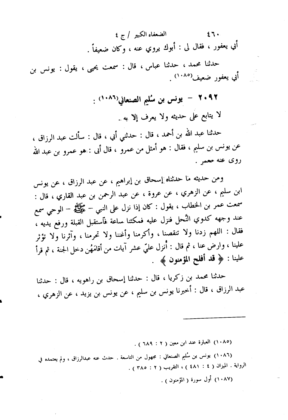 §2092 - يُونُسُ بْنُ سُلَيْمٍ الصَّنْعَانِيُّ لَا يُتَابَعُ عَلَى حَدِيثِهِ , وَلَا يُعْرَفُ إِلَّا بِهِ. حَدَّثَنَا عَبْدُ اللَّهِ بْنُ أَحْمَدَ قَالَ: حَدَّثَنِي أَبِي قَالَ: سَأَلْتُ عَبْدَ الرَّزَّاقِ عَنْ يُونُسَ بْنِ سُلَيْمٍ، فَقَالَ: هُوَ أَمْثَلُ مِنْ عَمْرٍو , قَالَ أَبِي: هُوَ عَمْرُو بْنُ عَبْدِ اللَّهِ , رَوَى عَنْهُ مَعْمَرٌ