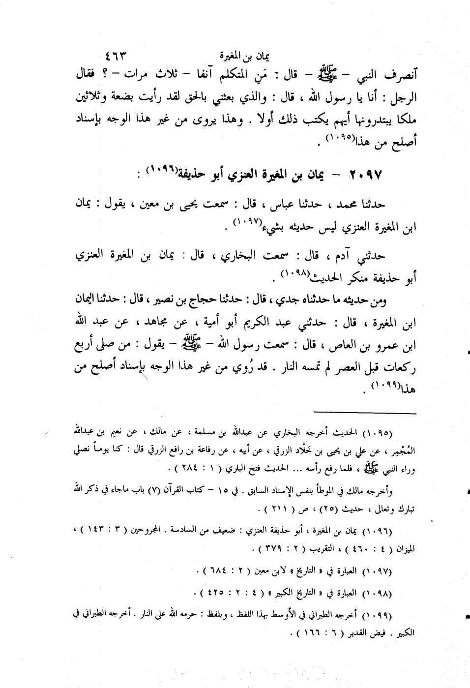 §2097 - يَمَانُ بْنُ الْمُغِيرَةِ الْعَنَزِيُّ أَبُو حُذَيْفَةَ حَدَّثَنَا مُحَمَّدٌ، حَدَّثَنَا عَبَّاسٌ قَالَ: سَمِعْتُ يَحْيَى بْنَ مَعِينٍ، يَقُولُ: يَمَانُ بْنُ الْمُغِيرَةِ الْعَنَزِيُّ لَيْسَ حَدِيثُهُ بِشَيْءٍ. حَدَّثَنِي آدَمُ قَالَ: سَمِعْتُ الْبُخَارِيَّ قَالَ: يَمَانُ بْنُ الْمُغِيرَةِ الْعَنَزِيُّ أَبُو حُذَيْفَةَ مُنْكَرُ الْحَدِيثِ