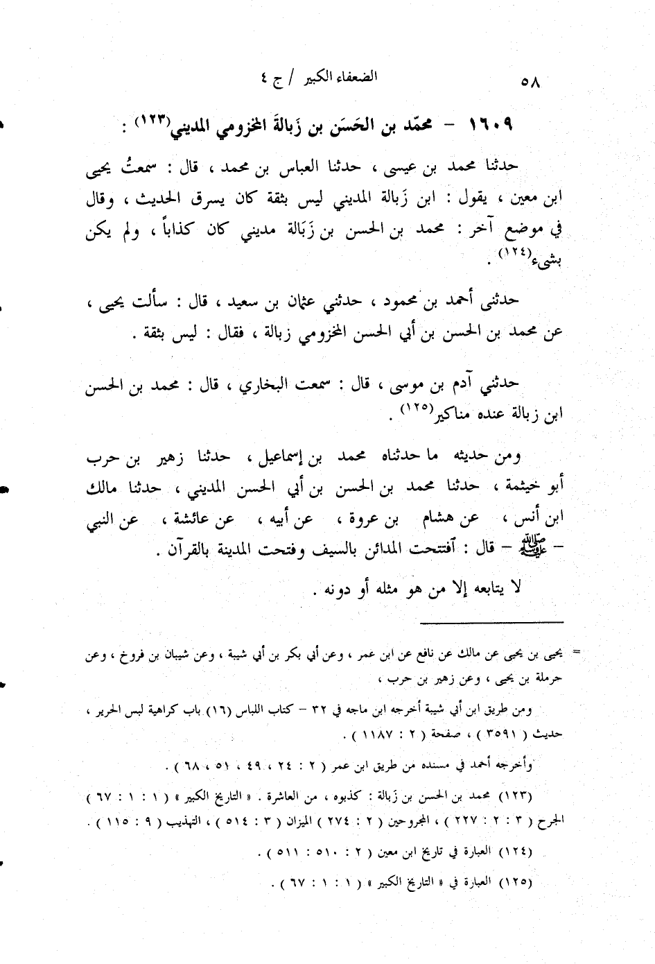 §1609 - مُحَمَّدُ بْنُ الْحَسَنِ بْنِ زُبَالَةَ الْمَخْزُومِيُّ الْمَدِينِيُّ حَدَّثَنَا مُحَمَّدُ بْنُ عِيسَى، حَدَّثَنَا الْعَبَّاسُ بْنُ مُحَمَّدٍ قَالَ: سَمِعْتُ يَحْيَى بْنَ مَعِينٍ، يَقُولُ: ابْنُ زُبَالَةَ الْمَدِينِيُّ لَيْسَ بِثِقَةٍ، كَانَ يَسْرِقُ الْحَدِيثَ، وَقَالَ فِي مَوْضِعٍ آخِرَ: مُحَمَّدُ بْنُ الْحَسَنِ بْنِ زُبَالَةَ مَدِينِيٌّ كَانَ كَذَّابًا وَلَمْ يَكُنْ بِشَيْءٍ. حَدَّثَنِي أَحْمَدُ بْنُ مَحْمُودٍ، حَدَّثَنِي عُثْمَانُ بْنُ سَعِيدٍ قَالَ: سَأَلْتُ يَحْيَى عَنْ مُحَمَّدِ بْنِ الْحَسَنِ بْنِ أَبِي الْحَسَنِ الْمَخْزُومِيِّ زُبَالَةَ، فَقَالَ: لَيْسَ بِثِقَةٍ. حَدَّثَنِي آدَمُ بْنُ مُوسَى قَالَ: سَمِعْتُ الْبُخَارِيَّ قَالَ: مُحَمَّدُ بْنُ الْحَسَنِ بْنِ زُبَالَةَ عِنْدَهُ مَنَاكِيرُ