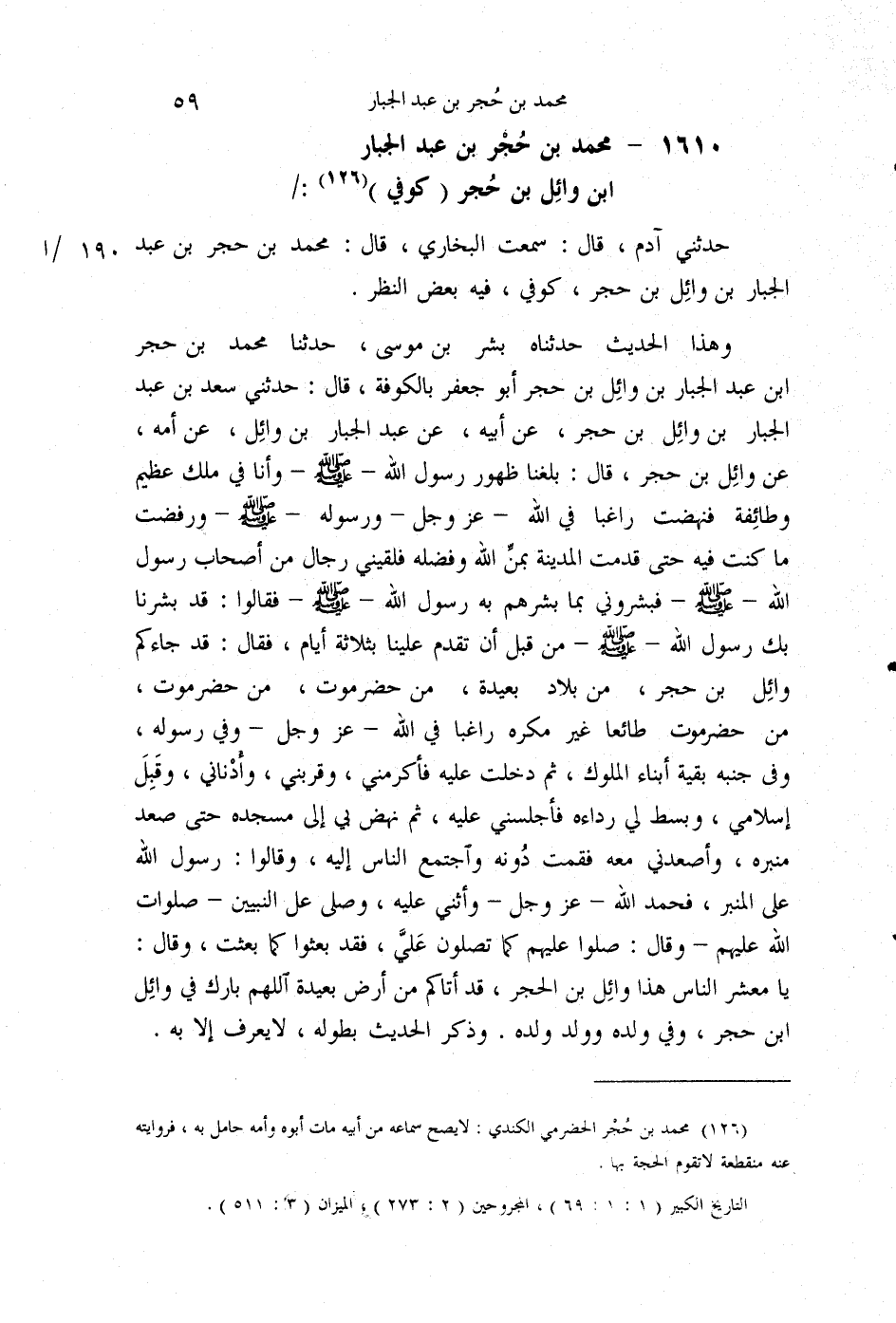 §1610 - مُحَمَّدُ بْنُ حُجْرِ بْنِ عَبْدِ الْجَبَّارِ بْنِ وَائِلِ بْنِ حُجْرٍ كُوفِيٌّ حَدَّثَنِي آدَمُ قَالَ: سَمِعْتُ الْبُخَارِيَّ قَالَ: مُحَمَّدُ بْنُ حُجْرِ بْنِ عَبْدِ الْجَبَّارِ بْنِ وَائِلِ بْنِ حُجْرٍ كُوفِيٌّ فِيهِ بَعْضُ النَّظَرِ