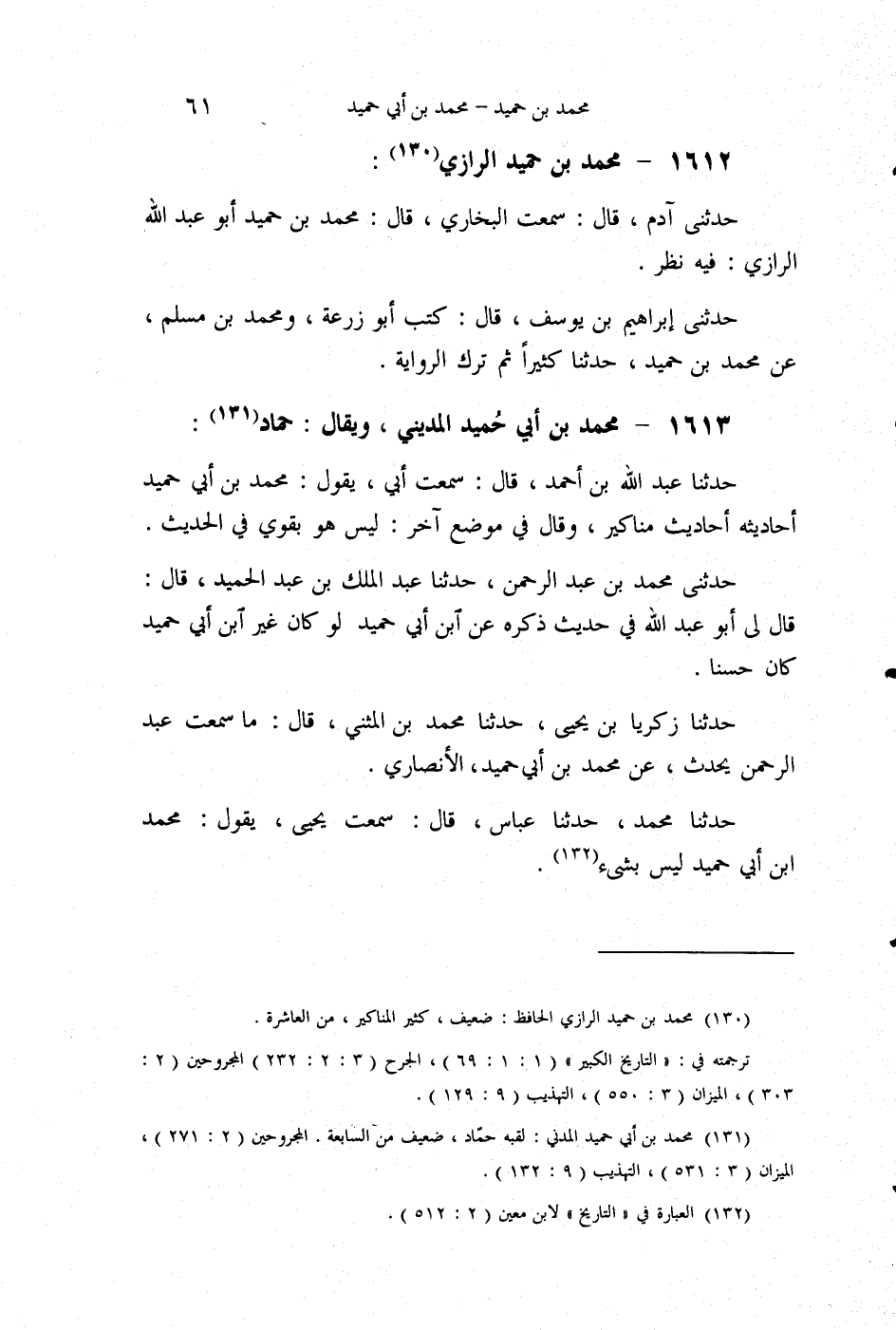 §1612 - مُحَمَّدُ بْنُ حُمَيْدٍ الرَّازِيُّ حَدَّثَنِي آدَمُ قَالَ: سَمِعْتُ الْبُخَارِيَّ قَالَ: مُحَمَّدُ بْنُ حُمَيْدٍ أَبُو عَبْدِ اللَّهِ الرَّازِيُّ فِيهِ نَظَرٌ. حَدَّثَنِي إِبْرَاهِيمُ بْنُ يُوسُفَ قَالَ: كَتَبَ أَبُو زُرْعَةَ، وَمُحَمَّدُ بْنُ مُسْلِمٍ , عَنْ مُحَمَّدِ بْنِ حُمَيْدٍ، حَدِيثًا كَثِيرًا، ثُمَّ تَرَكَا الرِّوَايَةَ