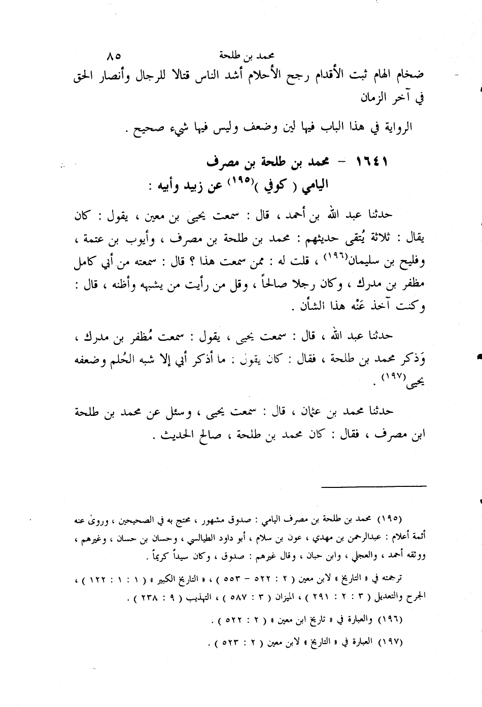 §1641 - مُحَمَّدُ بْنُ طَلْحَةَ بْنِ مُصَرِّفٍ الْيَامِيُّ كُوفِيٌّ عَنْ زُبَيْدٍ، وَأَبِيهِ. حَدَّثَنَا عَبْدُ اللَّهِ بْنُ أَحْمَدَ قَالَ: سَمِعْتُ يَحْيَى بْنَ مَعِينٍ، يَقُولُ كَانَ يُقَالُ: ثَلَاثَةٌ يُتَّقَى حَدِيثُهُمْ، مُحَمَّدُ بْنُ طَلْحَةَ بْنِ مُصَرِّفٍ، وَأَيُّوبُ بْنُ عُتْبَةَ، وَفُلَيْحُ بْنُ سُلَيْمَانَ، قُلْتُ لَهُ: مِمَّنْ سَمِعْتَ هَذَا؟ قَالَ: سَمِعْتُهُ مِنْ أَبِي كَامِلٍ مُظَفَّرِ بْنِ مُدْرِكٍ، وَكَانَ رَجُلًا صَالِحًا، وَقَلَّ مَنْ رَأَيْتُ مَنْ يُشْبِهُهُ، وَأَظُنُّهُ قَالَ: وَكُنْتُ آخُذُ عَنْهُ هَذَا الشَّأْنَ. حَدَّثَنَا عَبْدُ اللَّهِ قَالَ: سَمِعْتُ يَحْيَى يَقُولُ: سَمِعْتُ مُظَفَّرَ بْنَ مُدْرِكٍ، وَذَكَرَ مُحَمَّدَ بْنَ طَلْحَةَ، فَقَالَ: كَانَ يَقُولُ: مَا أَذْكُرُ أَبِي إِلَّا شِبْهَ الْحُلْمِ، وَضَعَّفَهُ يَحْيَى. حَدَّثَنَا مُحَمَّدُ بْنُ عُثْمَانَ قَالَ: سَمِعْتُ يَحْيَى، وَسُئِلَ عَنْ مُحَمَّدِ بْنِ طَلْحَةَ بْنِ مُصَرِّفٍ، فَقَالَ: كَانَ مُحَمَّدُ بْنُ طَلْحَةَ صَالِحَ الْحَدِيثِ -[86]-. حَدَّثَنَا مُحَمَّدُ بْنُ عِيسَى، حَدَّثَنَا عَبَّاسٌ قَالَ: سَمِعْتُ يَحْيَى قَالَ: مُحَمَّدُ بْنُ طَلْحَةَ بْنِ مُصَرِّفٍ لَيْسَ بِشَيْءٍ. حَدَّثَنَا عَبْدُ اللَّهِ قَالَ: قَالَ أَبِي: مُحَمَّدُ بْنُ طَلْحَةَ ثِقَةٌ، إِلَّا أَنَّهُ كَانَ لَا يَكَادُ يَقُولُ فِي شَيْءٍ مِنْ حَدِيثِهِ: حَدَّثَنَا