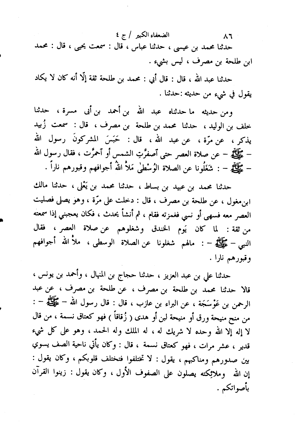 حَدَّثَنَا مُحَمَّدُ بْنُ عُبَيْدِ بْنِ بِسَاطٍ، حَدَّثَنَا مُحَمَّدُ بْنُ يَعْلَى، حَدَّثَنَا مَالِكُ بْنُ مِغْوَلٍ، عَنْ طَلْحَةَ بْنِ مُصَرِّفٍ قَالَ: دَخَلْتُ عَلَى مُرَّةَ، وَهُوَ يُصَلِّي فَصَلَّيْتُ الْعَصْرَ مَعَهُ، فَسَهَى أَوْ نَسِيَ، فَغَمَزْتُهُ فَقَامَ، ثُمَّ أَنْشَأَ يُحَدِّثُ فَكَانَ يُعْجِبُنِي إِذَا سَمِعْتُهُ مِنْ ثِقَةٍ: لَمَّا كَانَ يَوْمُ الْخَنْدَقِ وَشَغَلُوهُمْ عَنْ صَلَاةِ الْعَصْرِ، فَقَالَ النَّبِيُّ صَلَّى اللهُ عَلَيْهِ وَسَلَّمَ: «§مَالَهُمْ شَغَلُونَا عَنِ الصَّلَاةِ الْوُسْطَى، مَلَأَ اللَّهُ أَجْوَافَهُمْ وَقُبُورَهُمْ نَارًا»