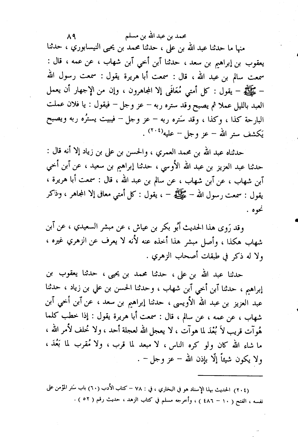 مِنْهَا مَا حَدَّثَنَا عَبْدُ اللَّهِ بْنُ عَلِيٍّ، حَدَّثَنَا مُحَمَّدُ بْنُ يَحْيَى النَّيْسَابُورِيُّ، حَدَّثَنَا يَعْقُوبُ بْنُ إِبْرَاهِيمَ بْنِ سَعْدٍ، حَدَّثَنَا ابْنُ أَخِي ابْنِ شِهَابٍ، عَنْ عَمِّهِ قَالَ: سَمِعْتُ سَالِمَ بْنَ عَبْدِ اللَّهِ قَالَ: سَمِعْتُ أَبَا هُرَيْرَةَ، يَقُولُ: سَمِعْتُ رَسُولَ اللَّهِ صَلَّى اللهُ عَلَيْهِ وَسَلَّمَ , يَقُولُ: " §كُلُّ أُمَّتِي مُعَافًى إِلَّا الْمُجَاهِرُونَ، وَإِنَّ مِنَ الْإِجْهَارِ أَنْ يَعْمَلَ الْعَبْدُ بِاللَّيْلِ عَمَلًا ثُمَّ يُصْبِحُ وَقَدْ سَتَرَهُ رَبُّهُ عَزَّ وَجَلَّ , فَيَقُولُ: يَا فُلَانُ عَمِلْتُ الْبَارِحَةَ كَذَا وَكَذَا، وَقَدْ سَتَرَهُ رَبُّهُ عَزَّ وَجَلَّ , فَيَبِيتُ يَسْتُرُهُ رَبُّهُ، وَيُصْبِحُ يَكْشِفُ سِتْرَ اللَّهِ عَزَّ وَجَلَّ عَلَيْهِ ". حَدَّثَنَاهُ عَبْدُ اللَّهِ بْنُ مُحَمَّدٍ الْعُمَرِيُّ، وَالْحَسَنُ بْنُ عَلِيِّ بْنِ زِيَادٍ، إِلَّا أَنَّهُ قَالَ: حَدَّثَنَا عَبْدُ الْعَزِيزِ بْنُ عَبْدِ اللَّهِ الْأُوَيْسِيُّ، حَدَّثَنَا إِبْرَاهِيمُ بْنُ سَعِيدٍ، عَنِ ابْنِ أَخِي ابْنِ شِهَابٍ، عَنِ ابْنِ شِهَابٍ، عَنْ سَالِمِ بْنِ عَبْدِ اللَّهِ قَالَ: سَمِعْتُ أَبَا هُرَيْرَةَ، يَقُولُ: سَمِعْتُ رَسُولَ اللَّهِ صَلَّى اللهُ عَلَيْهِ وَسَلَّمَ , يَقُولُ: «كُلُّ أُمَّتِي مُعَافًى إِلَّا الْمُجَاهِرَ» ، وَذَكَرَ نَحْوَهُ. وَقَدْ رَوَى هَذَا الْحَدِيثَ أَبُو بَكْرِ بْنُ عَيَّاشٍ، عَنْ مُبَشِّرٍ السَّعِيدِيِّ، عَنِ ابْنِ شِهَابٍ، هَكَذَا وَلَعَلَّ مُبَشِّرًا هَذَا أَخَذَهُ عَنْهُ لِأَنَّهُ لَا يَعْرِفُ عَنِ الزُّهْرِيِّ غَيْرَهُ , وَلَا لَهُ ذِكْرٌ فِي طَبَقَاتٍ أَصْحَابِ الزُّهْرِيِّ