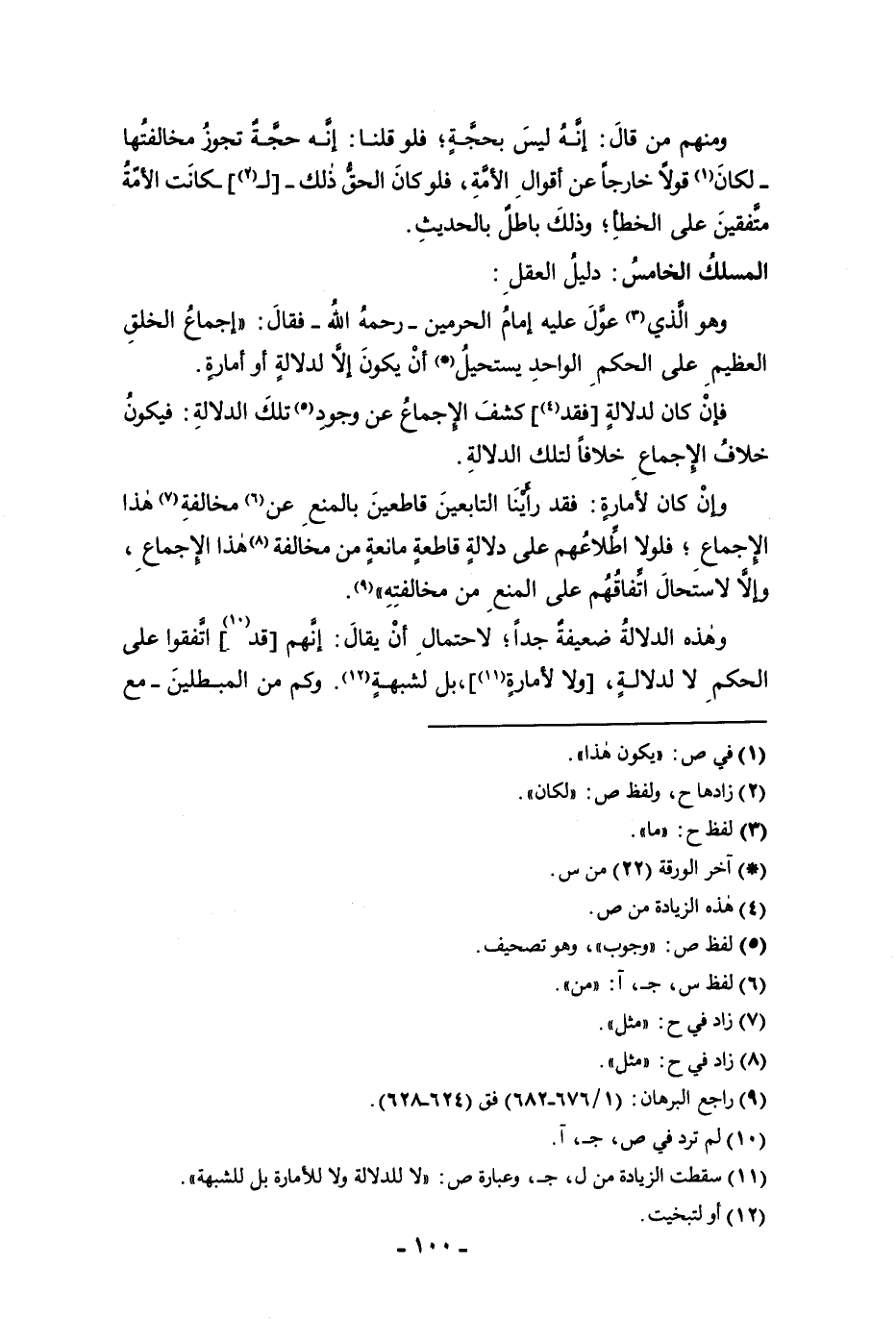 ومنهم من قال أنه ليس بحجة فلو قلنا إنه حجة تجوز مخالفتها لكان قولا خارجا عن أقول الأمة فلو كان الحق ذلك لكانت الأمة متفقين على الخطأ وذلك باطل بالحديث المسلك الخامس دليل العقل وهو الذي عول عليه إمام الحرمين رحمه الله فقال إجماع الخلق